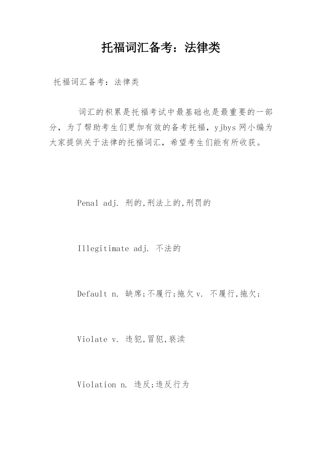 托福词汇备考:法律类托福词汇备考:法律类词汇的积累是托福考试中最基础也是最重要的一部分,为了帮助考生们更加有效的备考托福,yjbys网小编为大家提供关于法律的托福词汇,希望考生们能有所收获。Penaladj.刑的,刑法上的,刑罚的Illegitimateadj.不法的Defaultn.缺席;不履行;拖欠v.不履行,拖欠;Violatev.违犯,冒犯,亵渎Violationn.违反;违反行为Compulsoryadj.被强制的,义务的,强迫的Obligev.强制,束缚Responsibleadj.有责任的,