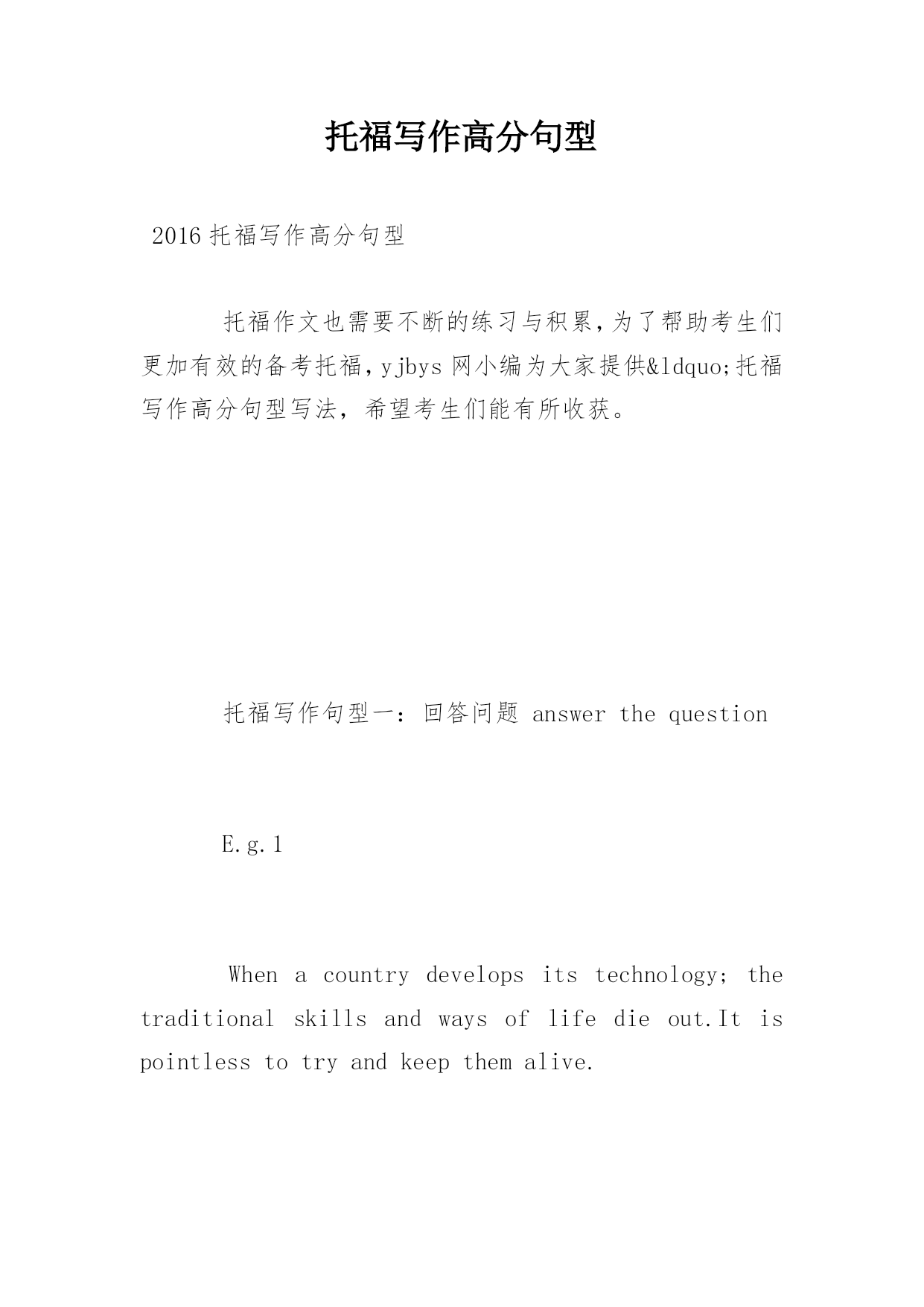 托福写作高分句型2016托福写作高分句型托福作文也需要不断的练习与积累,为了帮助考生们更加有效的备考托福,yjbys网小编为大家提供“托福写作高分句型写法,希望考生们能有所收获。托福写作句型一:回答问题answerthequestionE.g.1Whenacountrydevelopsitstechnology;thetraditionalskillsandwaysoflifedieout.Itispointlesstotryandkeepthemalive.Towhatextentdoyou