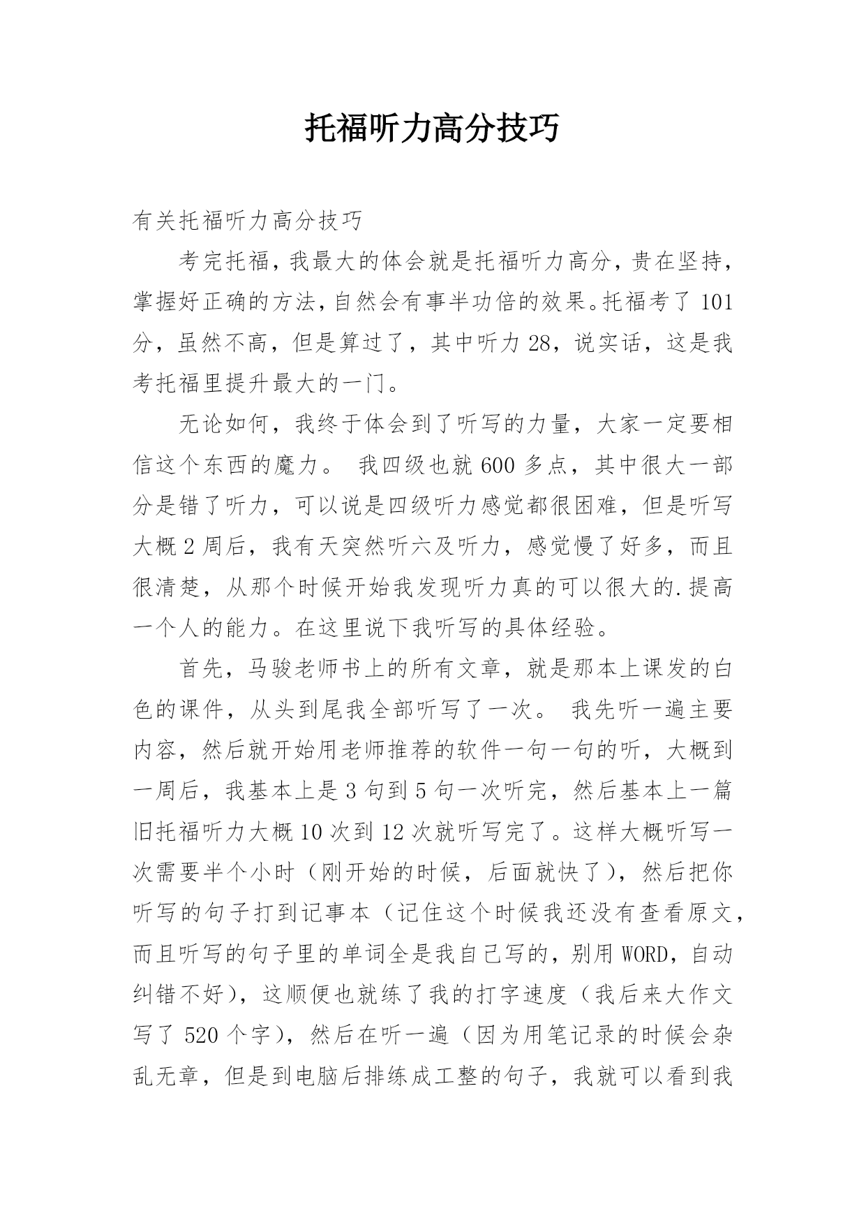 托福听力高分技巧有关托福听力高分技巧考完托福,我最大的体会就是托福听力高分,贵在坚持,掌握好正确的方法,自然会有事半功倍的效果。托福考了101分,虽然不高,但是算过了,其中听力28,说实话,这是我考托福里提升最大的一门。无论如何,我终于体会到了听写的力量,大家一定要相信这个东西的魔力。我四级也就600多点,其中很大一部分是错了听力,可以说是四级听力感觉都很困难,但是听写大概2周后,我有天突然听六及听力,感觉慢了好多,而且很清楚,从那个时候开始我发现听力真的可以很大的.提高一个人的能力。在这里说下我听写的具