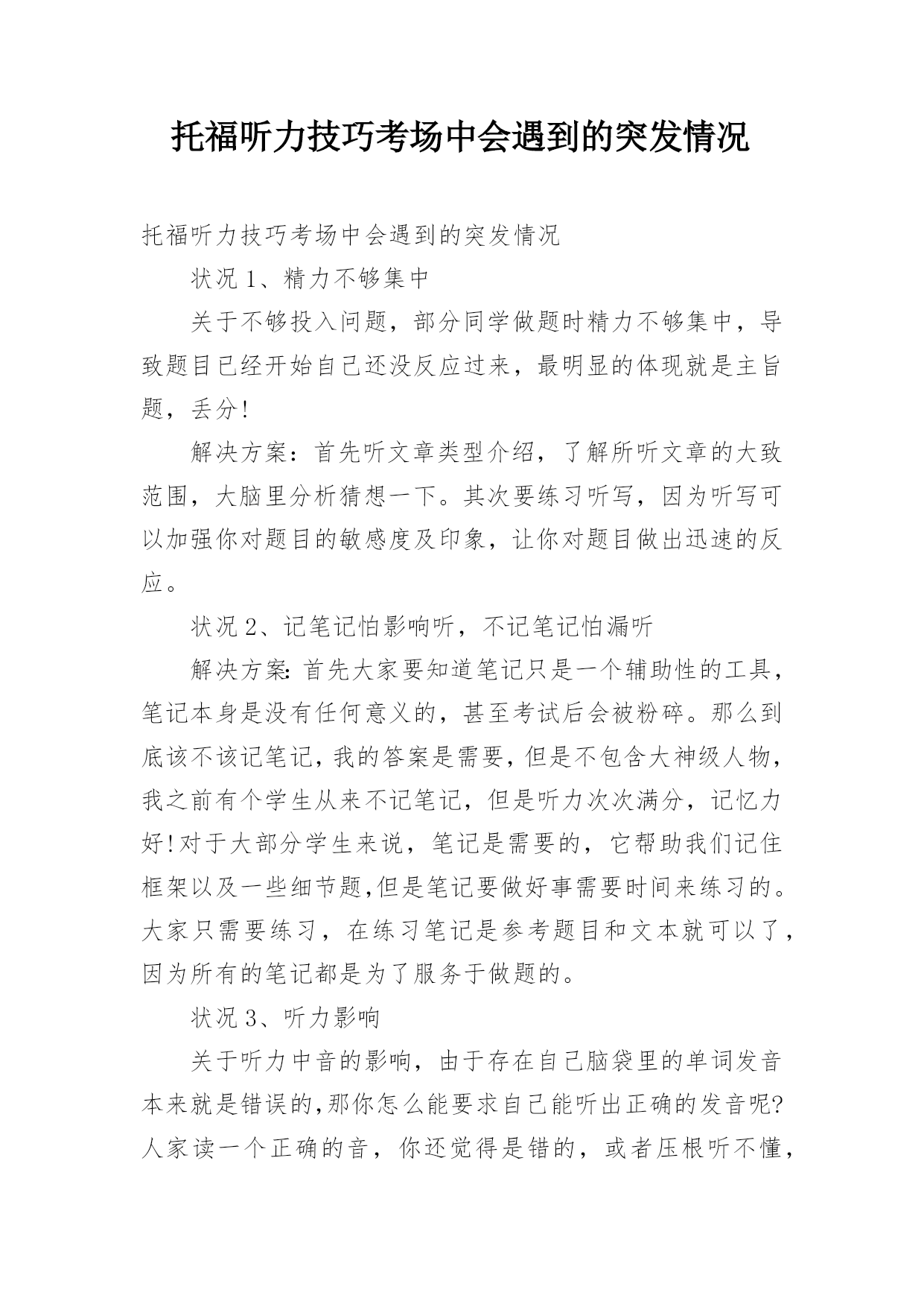 托福听力技巧考场中会遇到的突发情况托福听力技巧考场中会遇到的突发情况状况1、精力不够集中关于不够投入问题,部分同学做题时精力不够集中,导致题目已经开始自己还没反应过来,最明显的体现就是主旨题,丢分!解决方案:首先听文章类型介绍,了解所听文章的大致范围,大脑里分析猜想一下。其次要练习听写,因为听写可以加强你对题目的敏感度及印象,让你对题目做出迅速的反应。状况2、记笔记怕影响听,不记笔记怕漏听解决方案:首先大家要知道笔记只是一个辅助性的工具,笔记本身是没有任何意义的,甚至考试后会被粉碎。那么到底该不该记笔记,