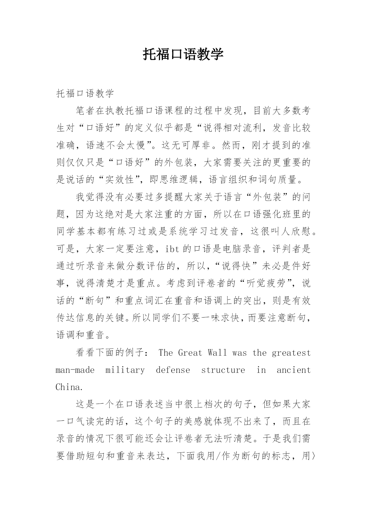 托福口语教学托福口语教学笔者在执教托福口语课程的过程中发现,目前大多数考生对“口语好”的定义似乎都是“说得相对流利,发音比较准确,语速不会太慢”。这无可厚非。然而,刚才提到的准则仅仅只是“口语好”的外包装,大家需要关注的更重要的是说话的“实效性”,即思维逻辑,语言组织和词句质量。我觉得没有必要过多提醒大家关于语言“外包装”的问题,因为这绝对是大家注重的方面,所以在口语强化班里的同学基本都有练习过或是系统学习过发音,这很叫人欣慰。可是,大家一定要注意,ibt的口语是电脑录音,评判者是通过听录音来做分数评估的