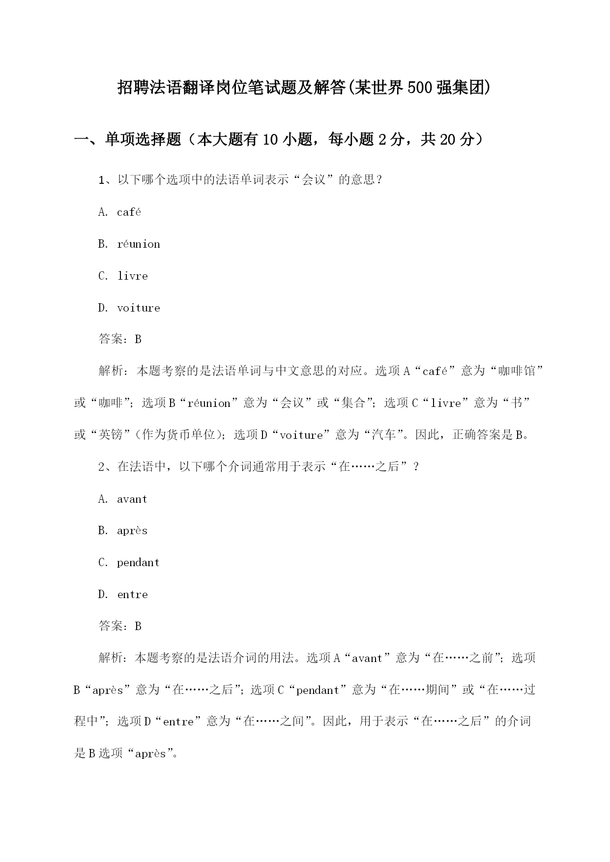 招聘法语翻译岗位笔试题及解答(某世界500强集团)一、单项选择题(本大题有10小题,每小题2分,共20分)1、以下哪个选项中的法语单词表示“会议”的意思?A.caféB.réunionC.livreD.voiture答案:B解析:本题考察的是法语单词与中文意思的对应。选项A“café”意为“咖啡馆”或“咖啡”;选项B“réunion”意为“会议”或“集合”;选项C“livre”意为“书”或“英镑”(作为货币单位);选项D“voiture”意为“汽车”。因此,正确答案是B。2、在法语中,以下哪个介词通常用于