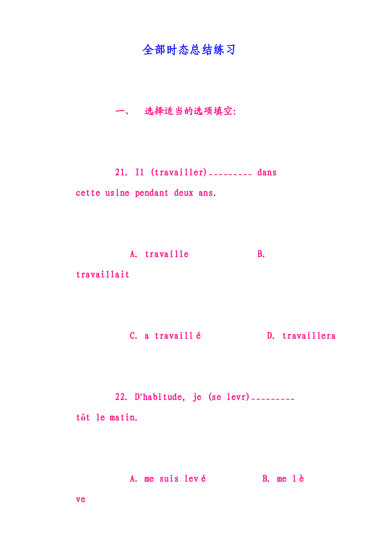全部时态总结练习选择适当的选项填空:21.Il(travailler)_________danscetteusinependantdeuxans.A.travailleB.travaillaitC.atravailléD.travaillera22.D’habitude,je(selevr)_________tôtlematin.A.mesuislevéB.melèveC.selèveD.melèverai23.Quandnous(arriver)_______austade,ilyavaitbeauco