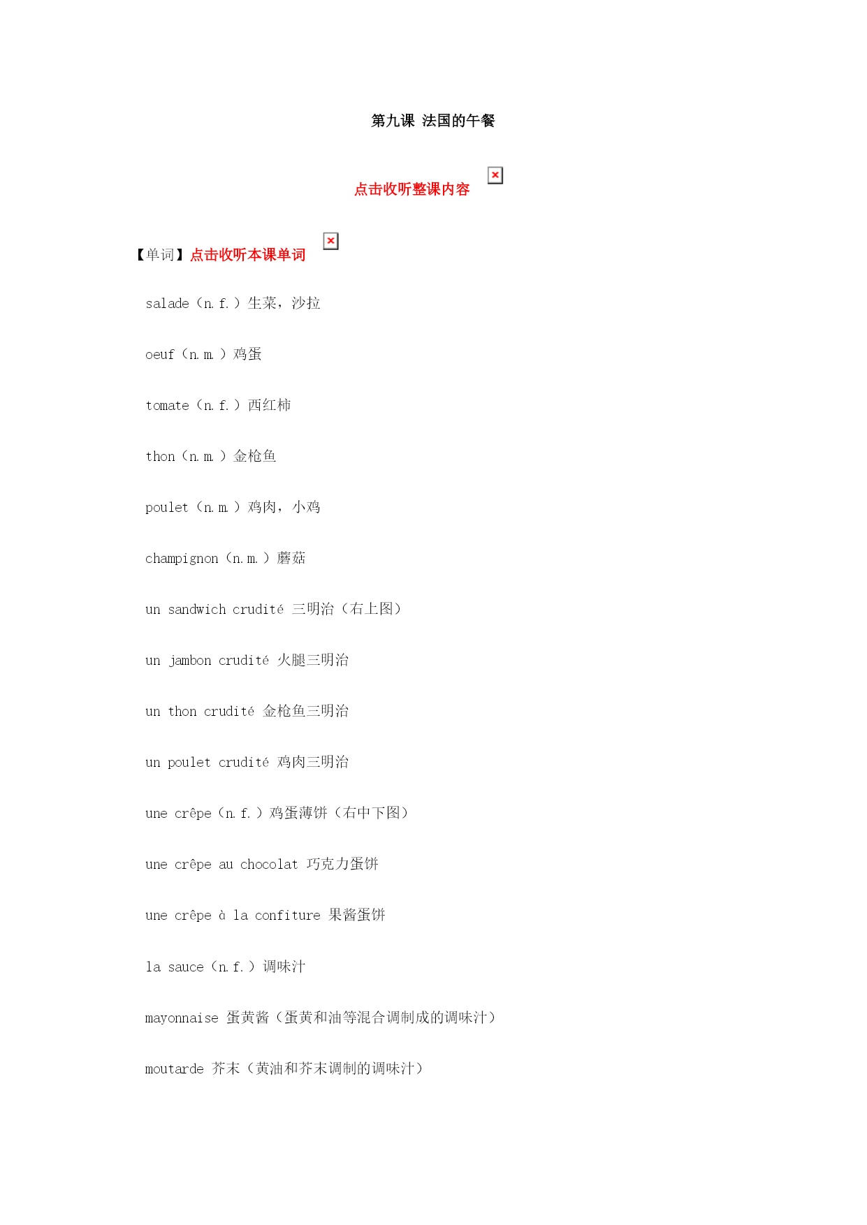 第九课法国的午餐点击收听整课内容【单词】点击收听本课单词salade(n.f.)生菜,沙拉oeuf(n.m.)鸡蛋tomate(n.f.)西红柿thon(n.m.)金枪鱼poulet(n.m.)鸡肉,小鸡champignon(n.m.)蘑菇unsandwichcrudité三明治(右上图)unjamboncrudité火腿三明治unthoncrudité金枪鱼三明治unpouletcrudité鸡肉三明治unecrêpe(n.f.)鸡蛋薄饼(右中下图)unecrêpeauchocolat巧克力蛋饼unec