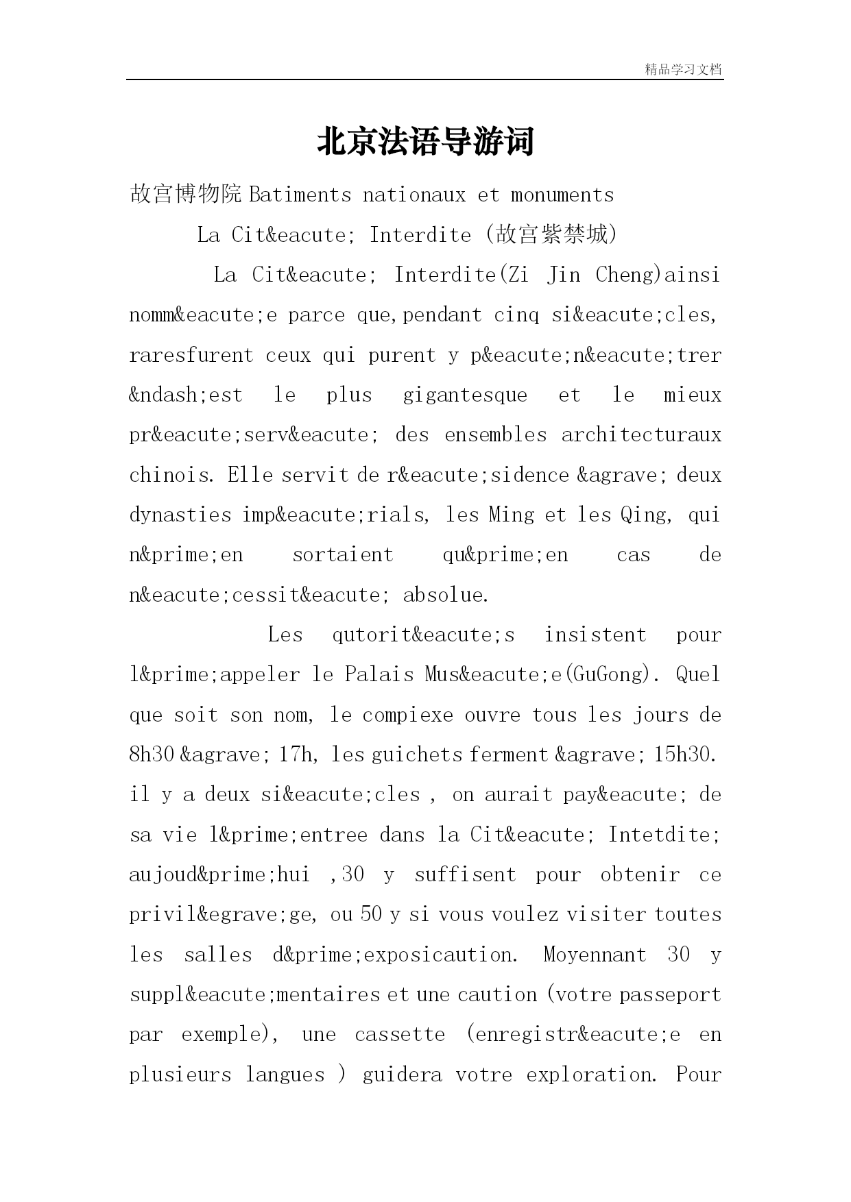 精品学习文档北京法语导游词故宫博物院BatimentsnationauxetmonumentsLaCitéInterdite(故宫紫禁城)LaCitéInterdite(ZiJinCheng)ainsinomméeparceque,pendantcinqsiécles,raresfurentceuxquipurentypénétrer–estleplusgigantesqueetlemieuxpré