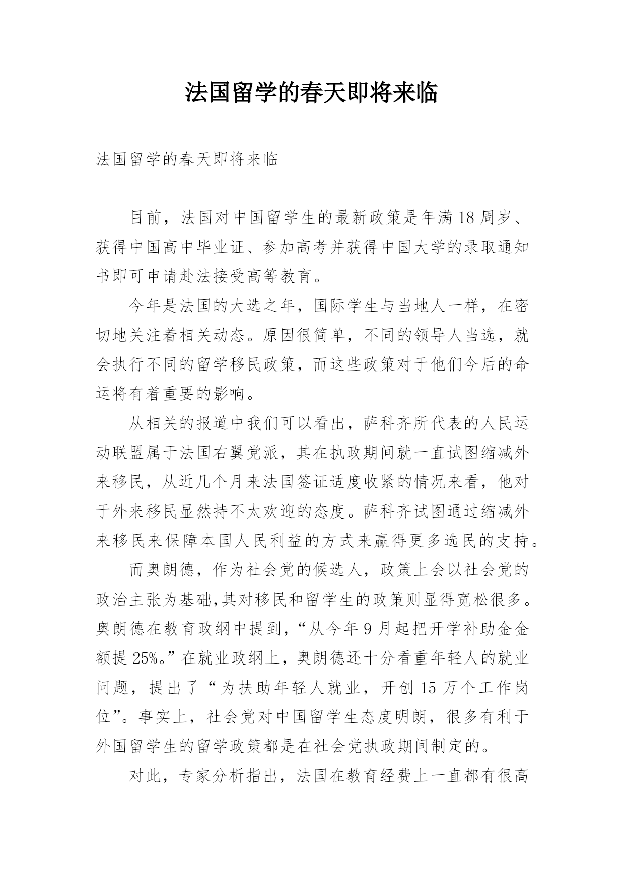 法国留学的春天即将来临法国留学的春天即将来临目前,法国对中国留学生的最新政策是年满18周岁、获得中国高中毕业证、参加高考并获得中国大学的录取通知书即可申请赴法接受高等教育。今年是法国的大选之年,国际学生与当地人一样,在密切地关注着相关动态。原因很简单,不同的领导人当选,就会执行不同的留学移民政策,而这些政策对于他们今后的命运将有着重要的影响。从相关的报道中我们可以看出,萨科齐所代表的人民运动联盟属于法国右翼党派,其在执政期间就一直试图缩减外来移民,从近几个月来法国签证适度收紧的情况来看,他对于外来移民显然