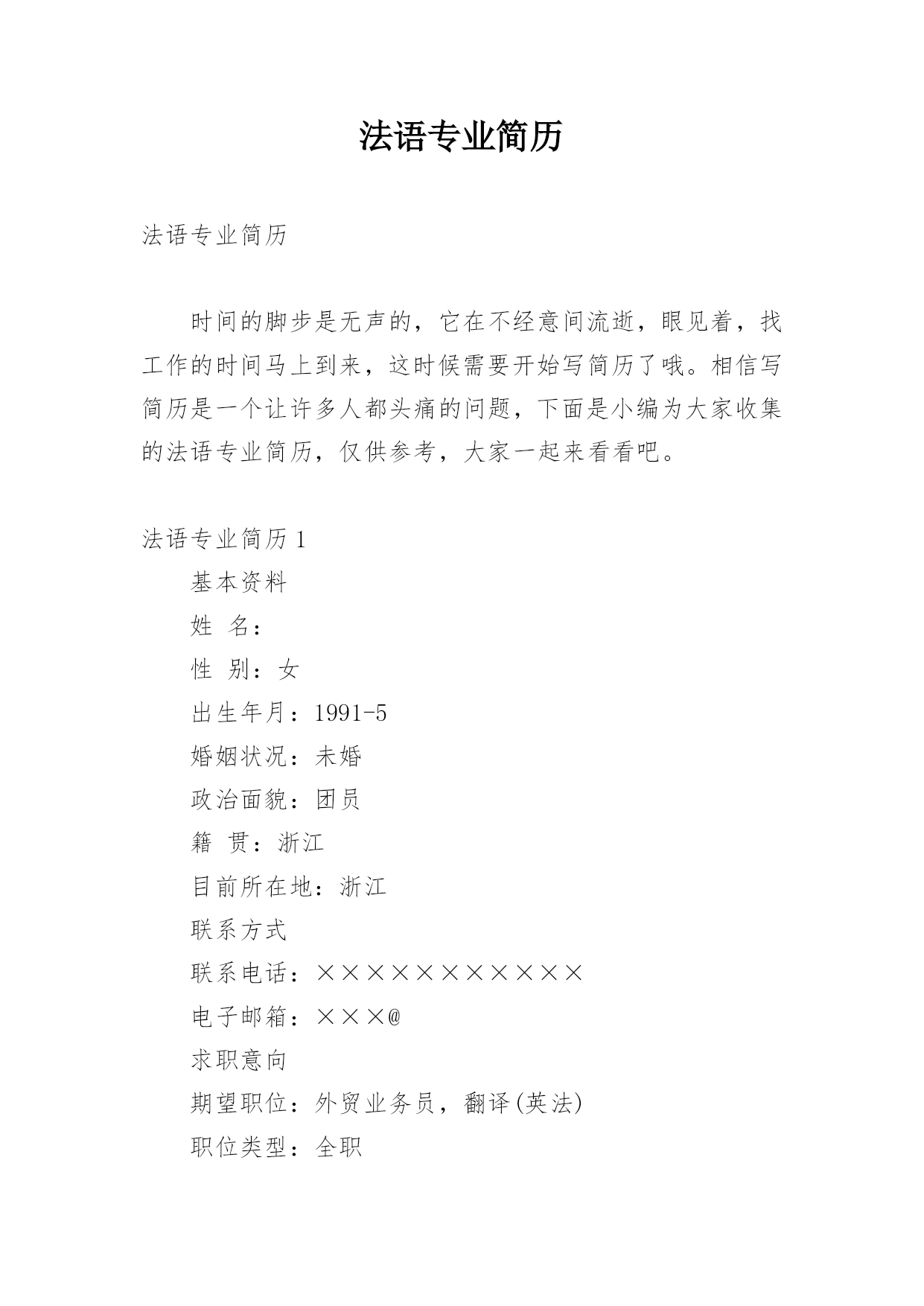 法语专业简历法语专业简历时间的脚步是无声的,它在不经意间流逝,眼见着,找工作的时间马上到来,这时候需要开始写简历了哦。相信写简历是一个让许多人都头痛的问题,下面是小编为大家收集的法语专业简历,仅供参考,大家一起来看看吧。法语专业简历1基本资料姓名:性别:女出生年月:1991-5婚姻状况:未婚政治面貌:团员籍贯:浙江目前所在地:浙江联系方式联系电话:×××××××××××电子邮箱:×××@求职意向期望职位:外贸业务员,翻译(英法)职位类型:全职工作地点:浙江工资待遇:面议工作经验XX-11—XX-10:××