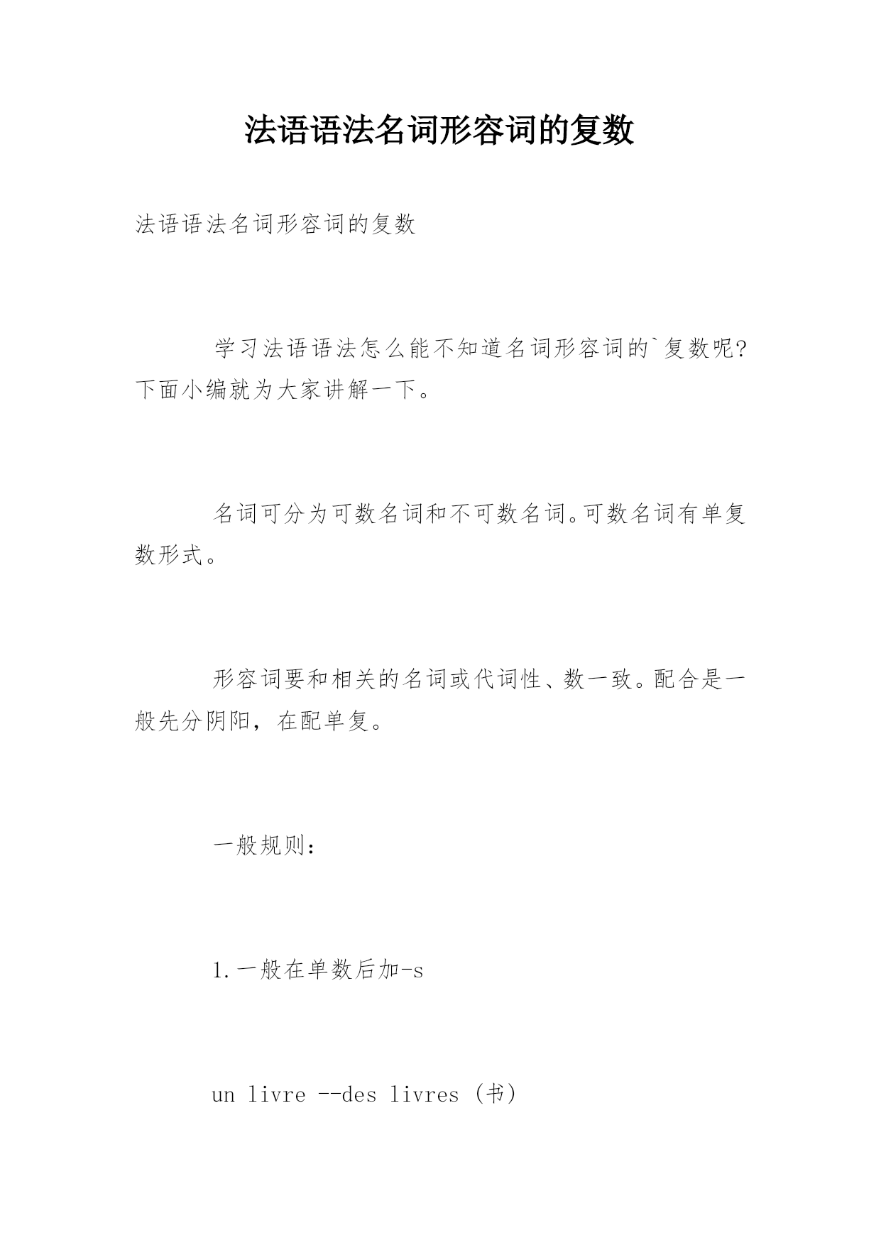 法语语法名词形容词的复数法语语法名词形容词的复数学习法语语法怎么能不知道名词形容词的`复数呢?下面小编就为大家讲解一下。名词可分为可数名词和不可数名词。可数名词有单复数形式。形容词要和相关的名词或代词性、数一致。配合是一般先分阴阳,在配单复。一般规则:1.一般在单数后加-sunlivre--deslivres(书)grand--grands(大的)特殊情况:2.以-s、-x、-z结尾的不变unevis--desvis(螺丝)Chinois--Chinois(中文的)3.以-au、-eau、-eu结尾,加-