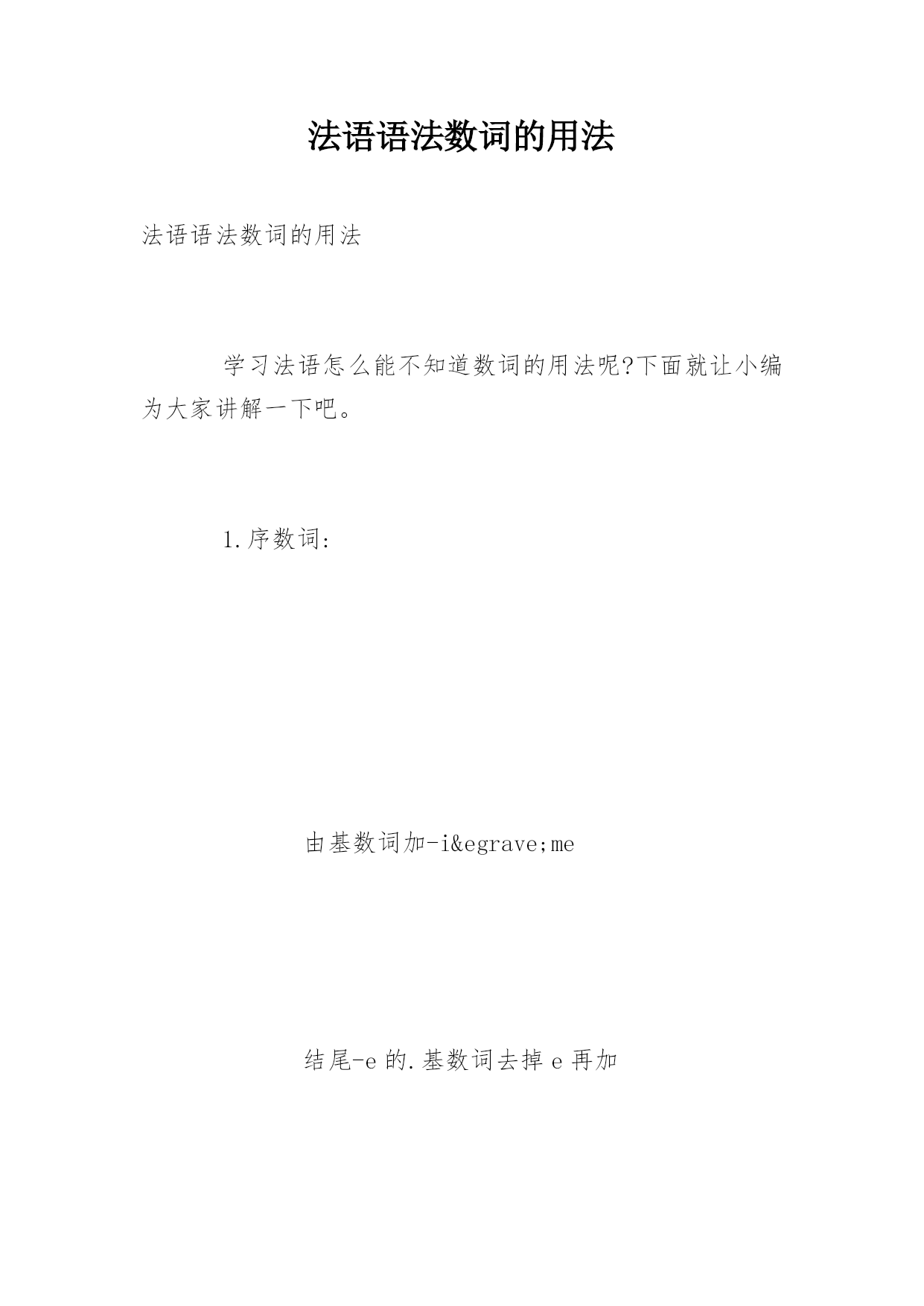 法语语法数词的用法法语语法数词的用法学习法语怎么能不知道数词的用法呢?下面就让小编为大家讲解一下吧。1.序数词:由基数词加-ième结尾-e的.基数词去掉e再加例外Deuxièmetroisièmesixièmehuitièmevingtièmequatrièmeonzièmedouzièmetrentièmemillièmepremiercinqui&