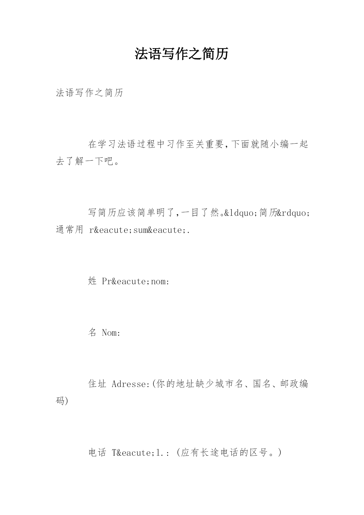 法语写作之简历法语写作之简历在学习法语过程中习作至关重要,下面就随小编一起去了解一下吧。写简历应该简单明了,一目了然。“简历”通常用résumé.姓Prénom:名Nom:住址Adresse:(你的地址缺少城市名、国名、邮政编码)电话Tél.:(应有长途电话的区号。)移动电话Mobile:性别Sexe:出生日期Datedenaissance:原籍Origine:国籍Nationalité:语言Langue:Chi