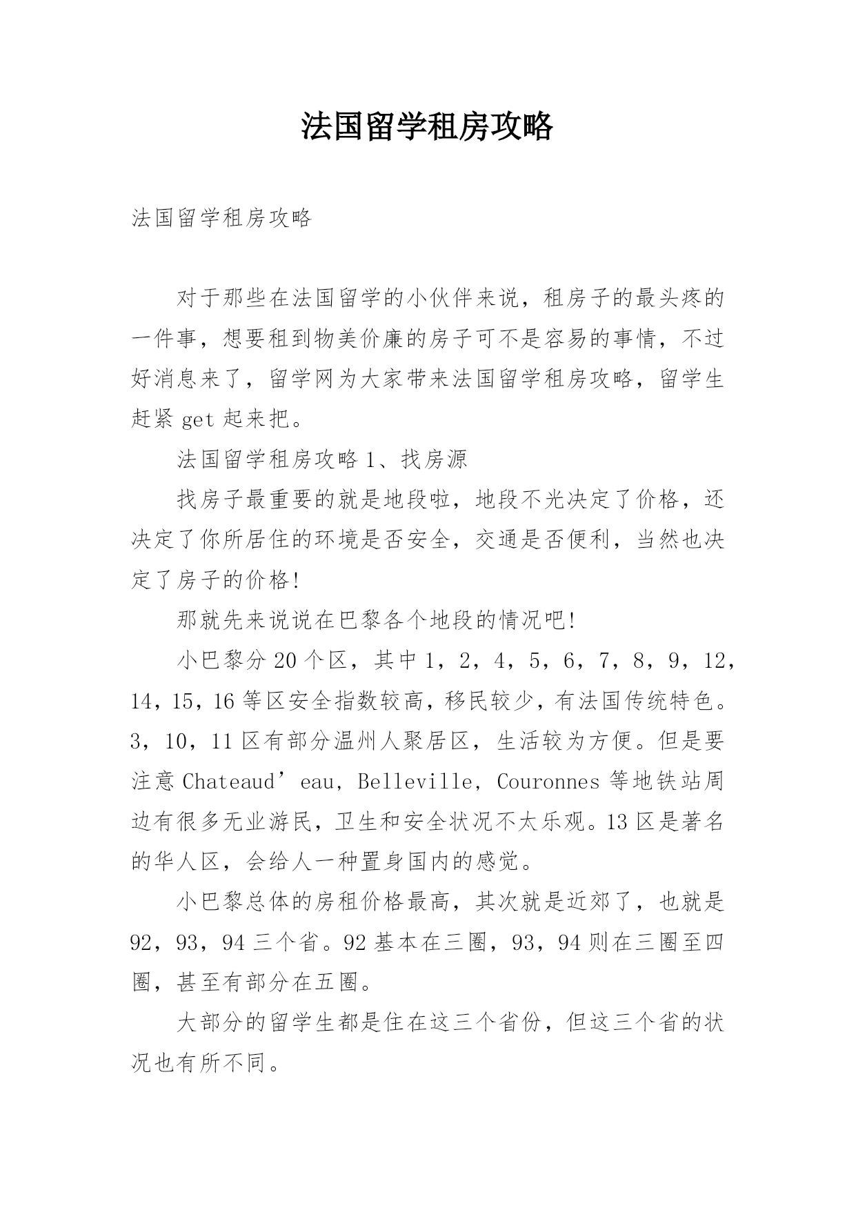 法国留学租房攻略法国留学租房攻略对于那些在法国留学的小伙伴来说,租房子的最头疼的一件事,想要租到物美价廉的房子可不是容易的事情,不过好消息来了,留学网为大家带来法国留学租房攻略,留学生赶紧get起来把。法国留学租房攻略1、找房源找房子最重要的就是地段啦,地段不光决定了价格,还决定了你所居住的环境是否安全,交通是否便利,当然也决定了房子的价格!那就先来说说在巴黎各个地段的情况吧!小巴黎分20个区,其中1,2,4,5,6,7,8,9,12,14,15,16等区安全指数较高,移民较少,有法国传统特色。3,10,
