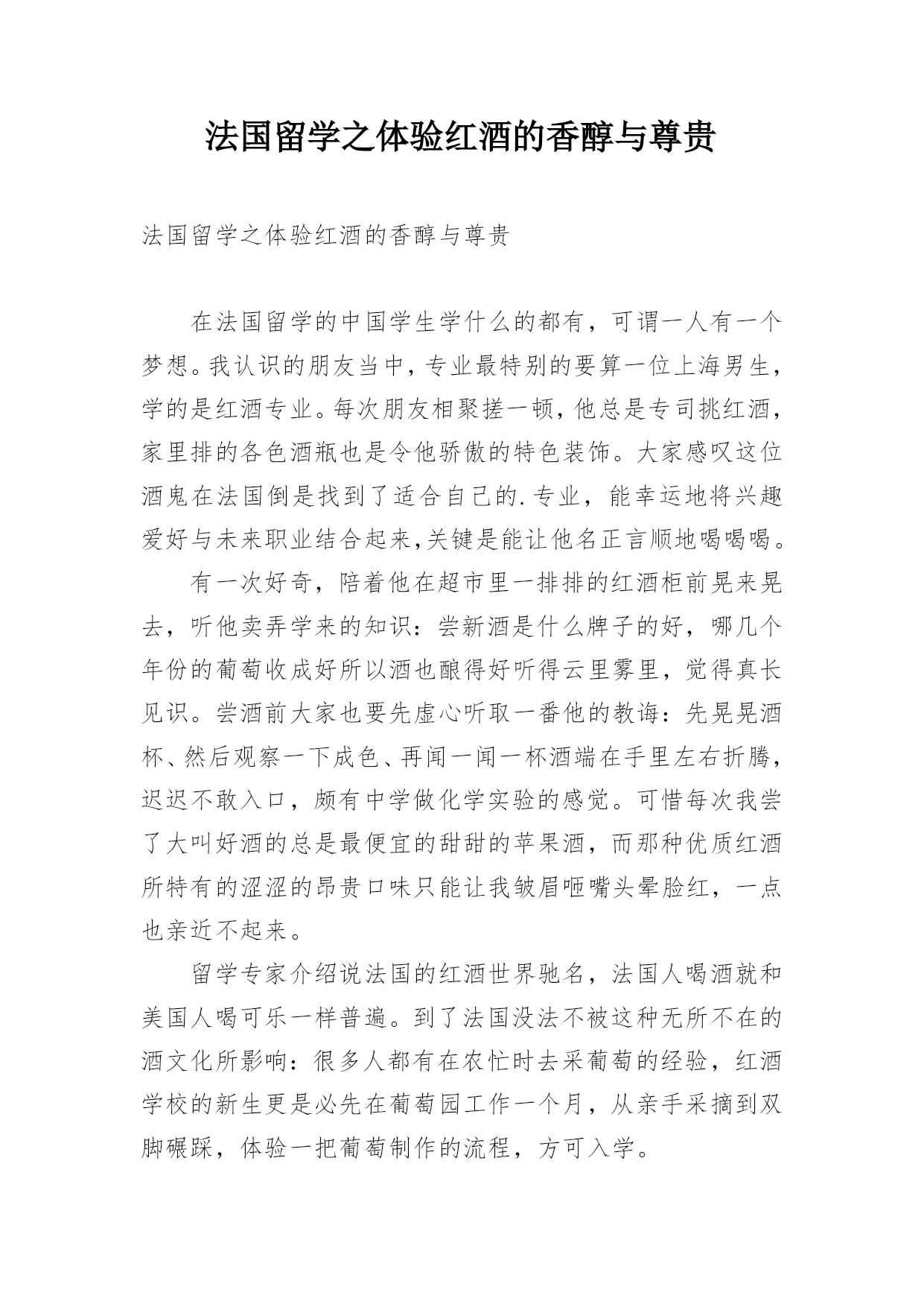 法国留学之体验红酒的香醇与尊贵法国留学之体验红酒的香醇与尊贵在法国留学的中国学生学什么的都有,可谓一人有一个梦想。我认识的朋友当中,专业最特别的要算一位上海男生,学的是红酒专业。每次朋友相聚搓一顿,他总是专司挑红酒,家里排的各色酒瓶也是令他骄傲的特色装饰。大家感叹这位酒鬼在法国倒是找到了适合自己的.专业,能幸运地将兴趣爱好与未来职业结合起来,关键是能让他名正言顺地喝喝喝。有一次好奇,陪着他在超市里一排排的红酒柜前晃来晃去,听他卖弄学来的知识:尝新酒是什么牌子的好,哪几个年份的葡萄收成好所以酒也酿得好听得云