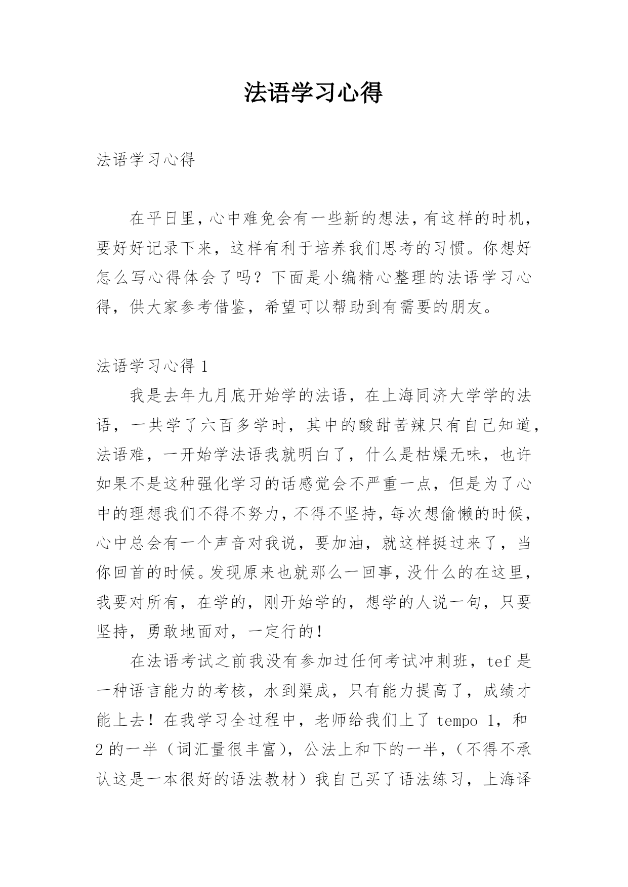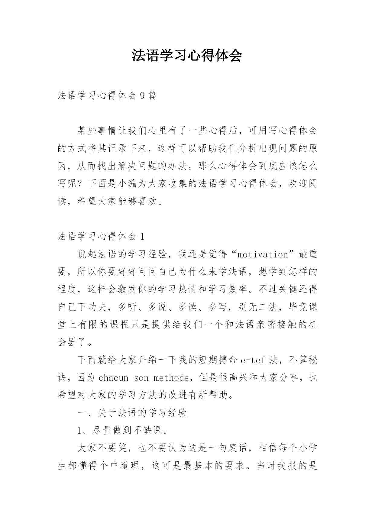 法语学习心得体会法语学习心得体会9篇某些事情让我们心里有了一些心得后,可用写心得体会的方式将其记录下来,这样可以帮助我们分析出现问题的原因,从而找出解决问题的办法。那么心得体会到底应该怎么写呢?下面是小编为大家收集的法语学习心得体会,欢迎阅读,希望大家能够喜欢。法语学习心得体会1说起法语的学习经验,我还是觉得“motivation”最重要,所以你要好好问问自己为什么来学法语,想学到怎样的程度,这样会激发你的学习热情和学习效率。不过关键还得自己下功夫,多听、多说、多读、多写,别无二法,毕竟课堂上有限的课程只