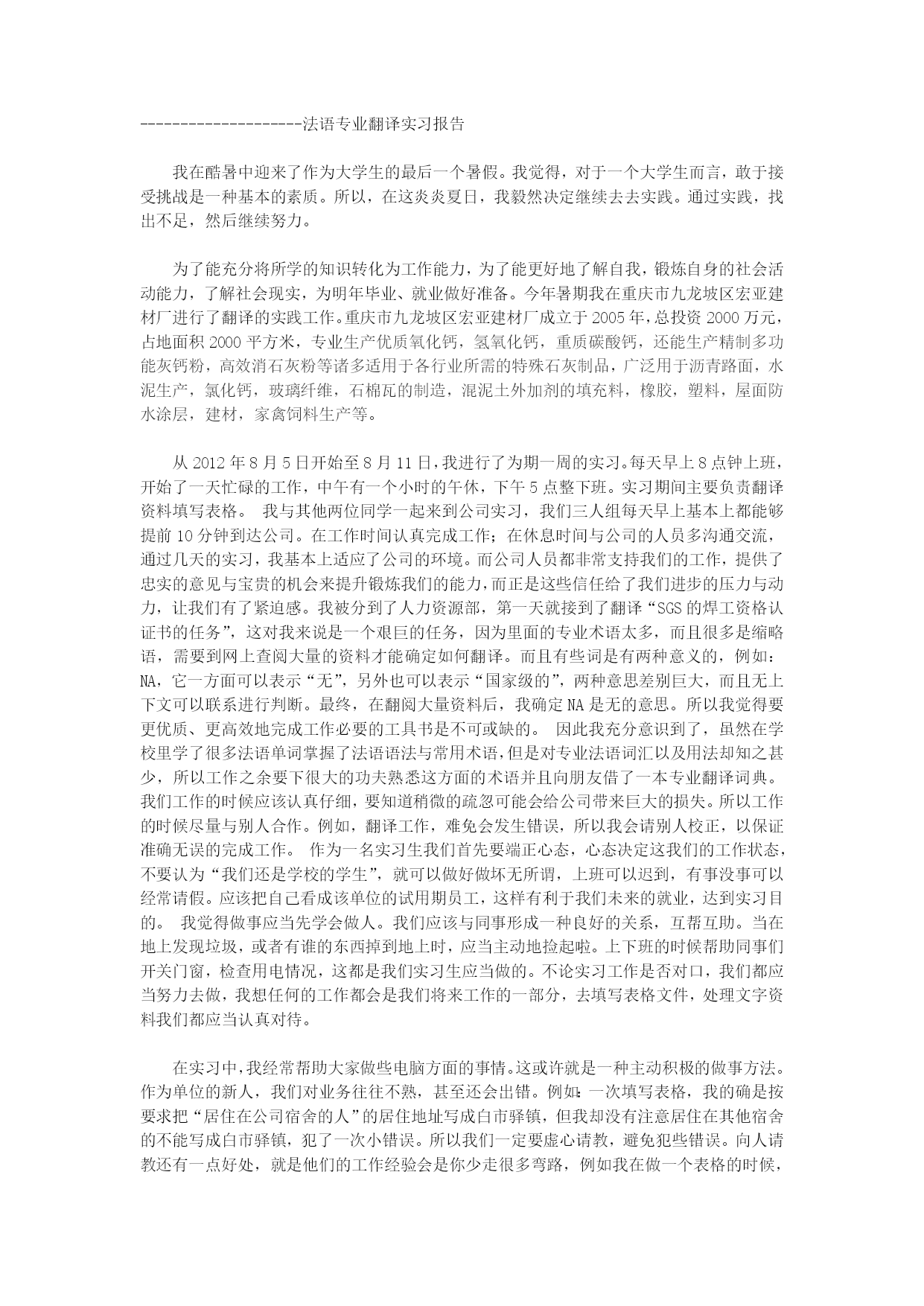 --------------------法语专业翻译实习报告我在酷暑中迎来了作为大学生的最后一个暑假。我觉得,对于一个大学生而言,敢于接受挑战是一种基本的素质。所以,在这炎炎夏日,我毅然决定继续去去实践。通过实践,找出不足,然后继续努力。为了能充分将所学的知识转化为工作能力,为了能更好地了解自我,锻炼自身的社会活动能力,了解社会现实,为明年毕业、就业做好准备。今年暑期我在重庆市九龙坡区宏亚建材厂进行了翻译的实践工作。重庆市九龙坡区宏亚建材厂成立于2005年,总投资2000万元,占地面积2000平方米,专业