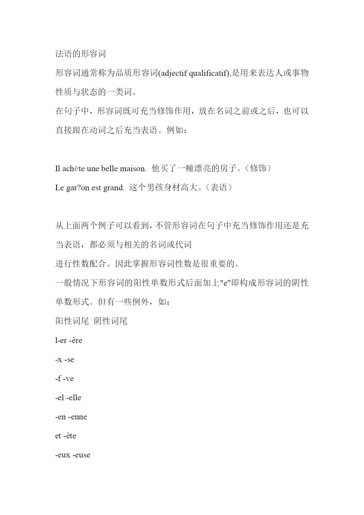 法语的形容词形容词通常称为品质形容词(adjectifqualificatif),是用来表达人或事物性质与状态的一类词。在句子中,形容词既可充当修饰作用,放在名词之前或之后,也可以直接跟在动词之后充当表语。例如:Ilachèteunebellemaison.他买了一幢漂亮的房子。(修饰)Legar?onestgrand.这个男孩身材高大。(表语)从上面两个例子可以看到,不管形容词在句子中充当修饰作用还是充当表语,都必须与相关的名词或代词进行性数配合。因此掌握形容词性数是很重要的。一般情况下形容词的阳性单数