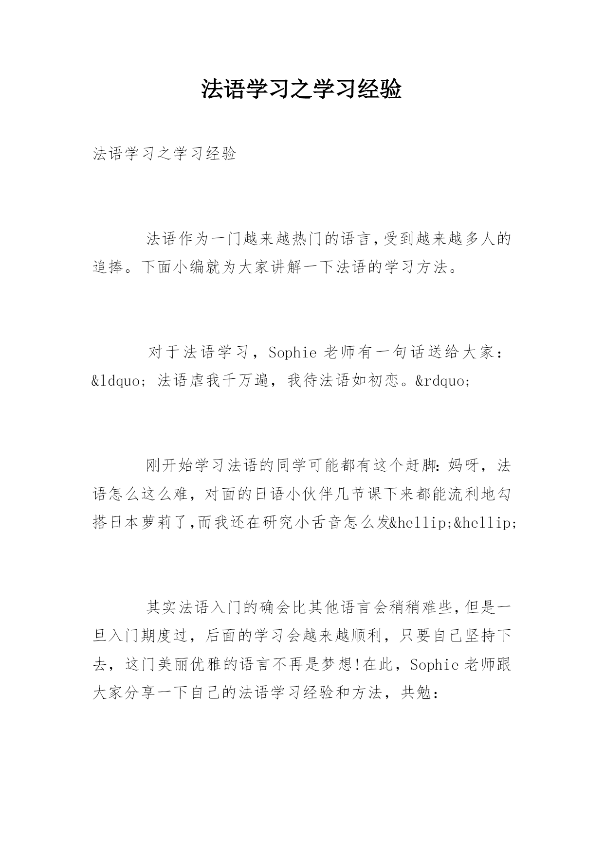 法语学习之学习经验法语学习之学习经验法语作为一门越来越热门的语言,受到越来越多人的追捧。下面小编就为大家讲解一下法语的学习方法。对于法语学习,Sophie老师有一句话送给大家:“法语虐我千万遍,我待法语如初恋。”刚开始学习法语的同学可能都有这个赶脚:妈呀,法语怎么这么难,对面的日语小伙伴几节课下来都能流利地勾搭日本萝莉了,而我还在研究小舌音怎么发……其实法语入门的确会比其他语言会稍稍难些,但是一旦入门期度过,后面的学习会越来越顺利,只要自己坚持下去,这门