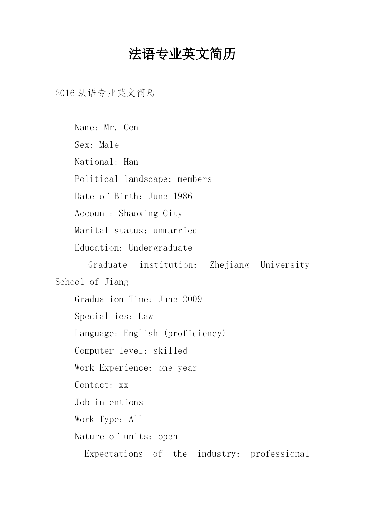 法语专业英文简历2016法语专业英文简历Name:Mr.CenSex:MaleNational:HanPoliticallandscape:membersDateofBirth:June1986Account:ShaoxingCityMaritalstatus:unmarriedEducation:UndergraduateGraduateinstitution:ZhejiangUniversitySchoolofJiangGraduationTime:June2009Specialties:LawLan