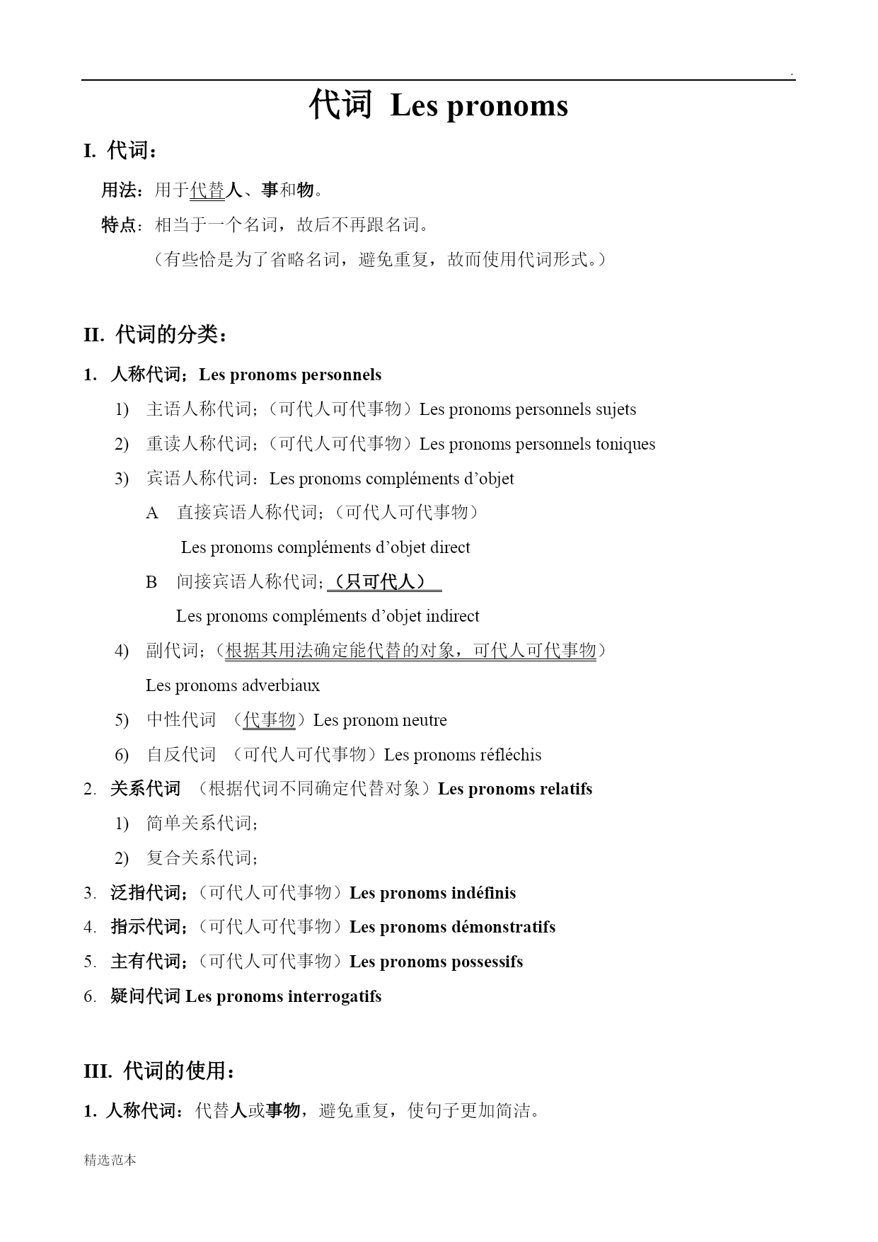 .精选范本代词LespronomsI.代词:用法:用于代替人、事和物。特点:相当于一个名词,故后不再跟名词。(有些恰是为了省略名词,避免重复,故而使用代词形式。)II.代词的分类:人称代词;Lespronomspersonnels主语人称代词;(可代人可代事物)Lespronomspersonnelssujets重读人称代词;(可代人可代事物)Lespronomspersonnelstoniques宾语人称代词:Lespronomscomplémentsd’objet直接宾语人称代词;(可代人可代事物)L