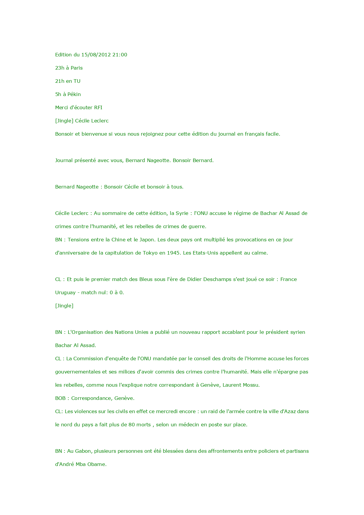 Editiondu15/08/201221:0023hàParis21henTU5hàPékinMercid'écouterRFI[Jingle]CécileLeclercBonsoiretbienvenuesivousnousrejoignezpourcetteéditiondujournalenfrançaisfacile.Journalprésentéavecvous,BernardNageotte.BonsoirBernard.BernardNageotte:BonsoirCécileetbons