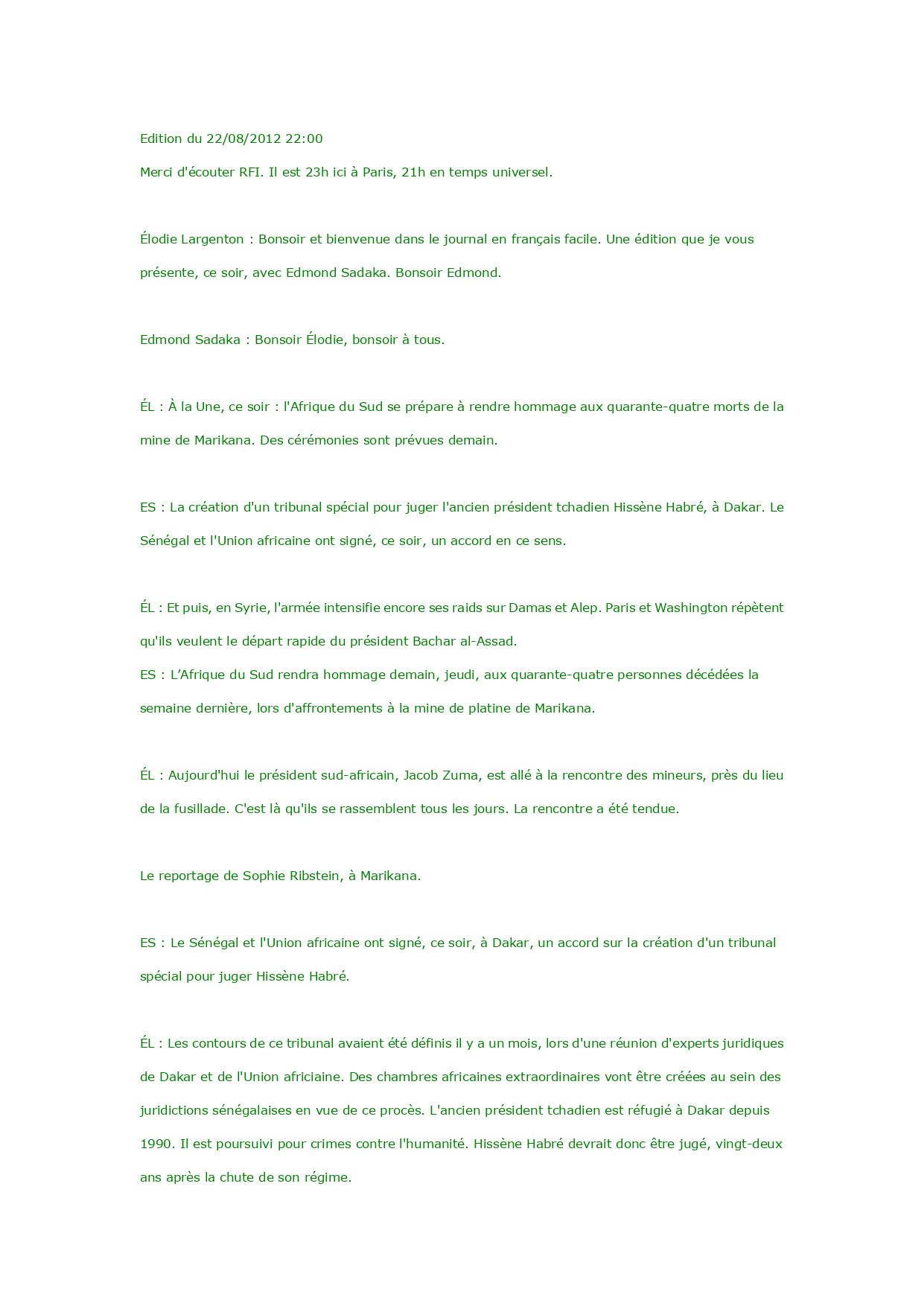 Editiondu22/08/201222:00Mercid'écouterRFI.Ilest23hiciàParis,21hentempsuniversel.ÉlodieLargenton:Bonsoiretbienvenuedanslejournalenfrançaisfacile.Uneéditionquejevousprésente,cesoir,avecEdmondSadaka.BonsoirEdmond.EdmondSadaka:BonsoirÉlodie,bonsoiràtous.ÉL:Àl