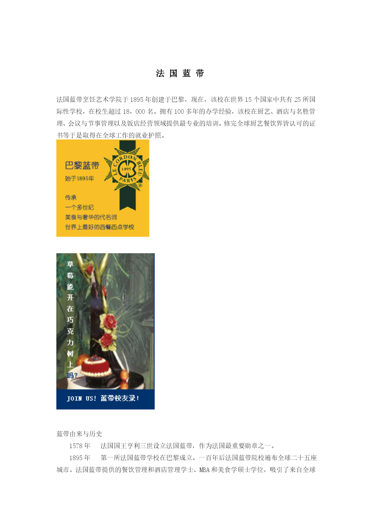 法国蓝带法国蓝带烹饪艺术学院于1895年创建于巴黎,现在,该校在世界15个国家中共有25所国际性学校,在校生超过18,000名。拥有100多年的办学经验,该校在厨艺、酒店与名胜管理、会议与节事管理以及饭店经营领域提供最专业的培训。修完全球厨艺餐饮界皆认可的证书等于是取得在全球工作的就业护照。蓝带由来与历史1578年法国国王亨利三世设立法国蓝带,作为法国最重要勋章之一。1895年第一所法国蓝带学校在巴黎成立。一百年后法国蓝带院校遍布全球二十五座城市。法国蓝带提供的餐饮管理和酒店管理学士、MBA和美食学硕士学