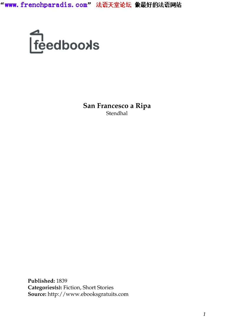 SanFrancescoaRipaStendhalPublished:1839Categories(s):Fiction,ShortStoriesSource:http://www.ebooksgratuits.com1AproposdeStendhal:Marie-HenriBeyle(January23,1783–March23,1842),betterknownbyhispennameStendhal,wasa19thcenturyFrenchwriter.Knownforhisacuteanaly