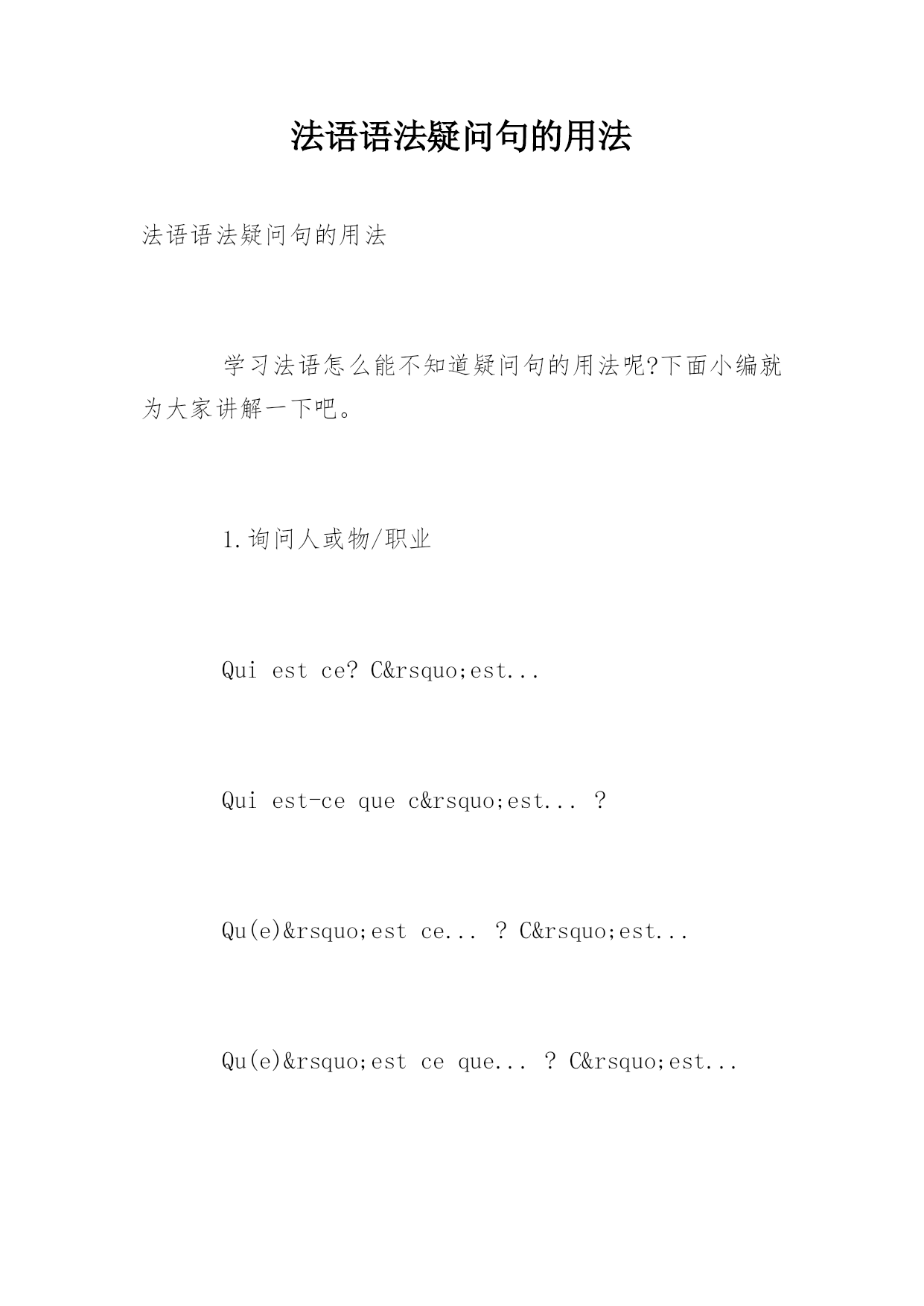 法语语法疑问句的用法法语语法疑问句的用法学习法语怎么能不知道疑问句的用法呢?下面小编就为大家讲解一下吧。1.询问人或物/职业Quiestce?C’est...Quiest-cequec’est...?Qu(e)’estce...?C’est...Qu(e)’estceque...?C’est...Quefait-t-il?Ilest+职业名词2.在哪里/住在哪里(楼层)Ouest....?...esta...Ouhabite-it?I