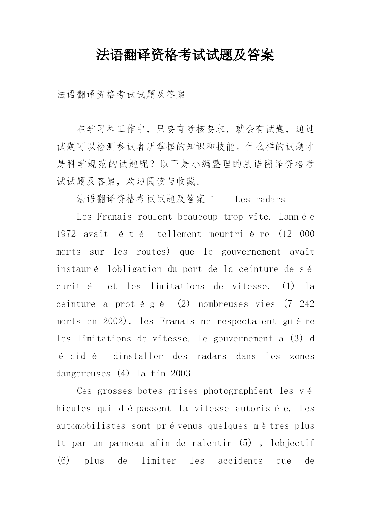法语翻译资格考试试题及答案法语翻译资格考试试题及答案在学习和工作中,只要有考核要求,就会有试题,通过试题可以检测参试者所掌握的知识和技能。什么样的试题才是科学规范的试题呢?以下是小编整理的法语翻译资格考试试题及答案,欢迎阅读与收藏。法语翻译资格考试试题及答案1LesradarsLesFranaisroulentbeaucouptropvite.Lannée1972avaitététellementmeurtrière(12000mortssurlesroutes)quelegouvernementavai