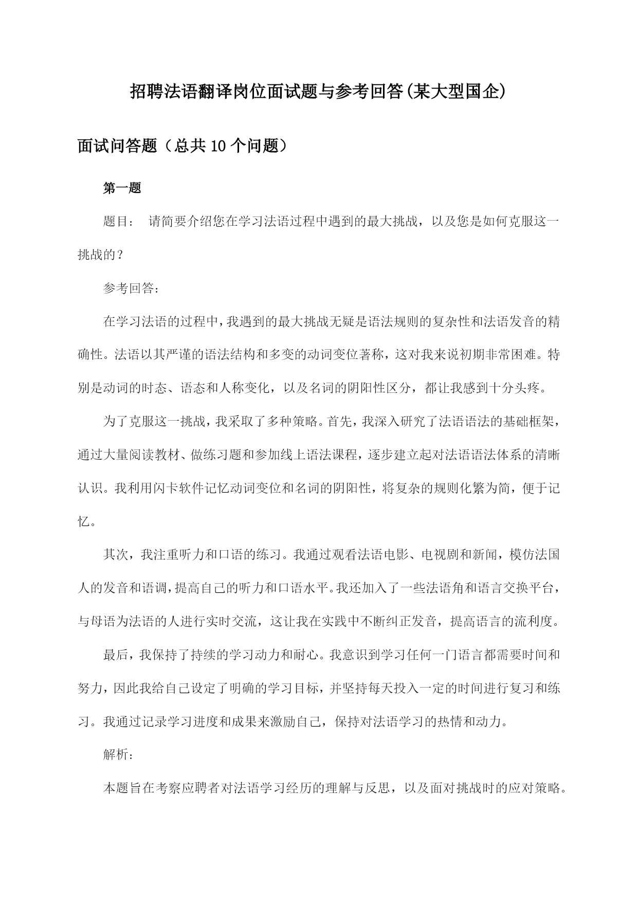 招聘法语翻译岗位面试题与参考回答(某大型国企)面试问答题(总共10个问题)第一题题目:请简要介绍您在学习法语过程中遇到的最大挑战,以及您是如何克服这一挑战的?参考回答:在学习法语的过程中,我遇到的最大挑战无疑是语法规则的复杂性和法语发音的精确性。法语以其严谨的语法结构和多变的动词变位著称,这对我来说初期非常困难。特别是动词的时态、语态和人称变化,以及名词的阴阳性区分,都让我感到十分头疼。为了克服这一挑战,我采取了多种策略。首先,我深入研究了法语语法的基础框架,通过大量阅读教材、做练习题和参加线上语法课程,