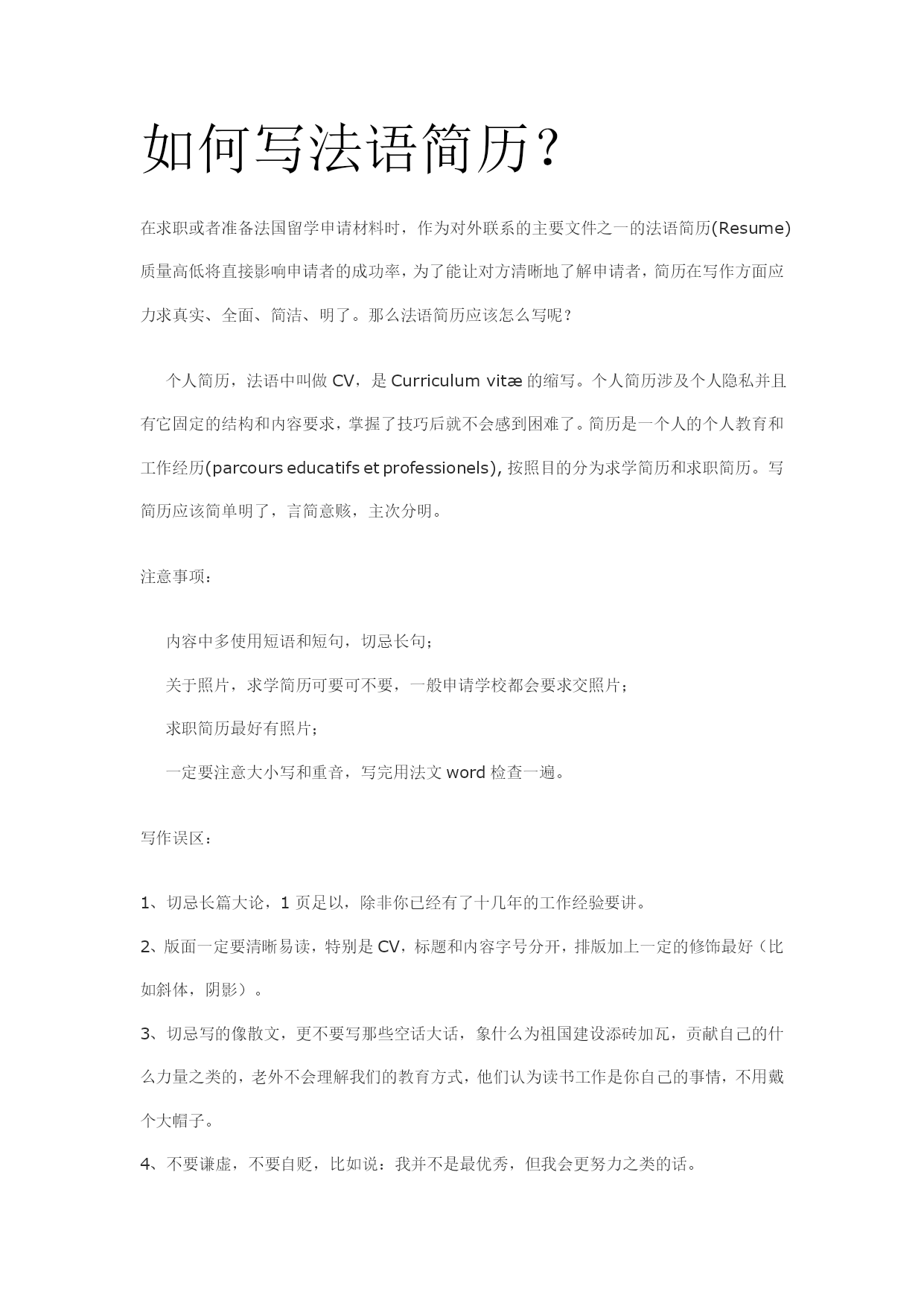 如何写法语简历?在求职或者准备法国留学申请材料时,作为对外联系的主要文件之一的法语简历(Resume)质量高低将直接影响申请者的成功率,为了能让对方清晰地了解申请者,简历在写作方面应力求真实、全面、简洁、明了。那么法语简历应该怎么写呢?个人简历,法语中叫做CV,是Curriculumvitæ的缩写。个人简历涉及个人隐私并且有它固定的结构和内容要求,掌握了技巧后就不会感到困难了。简历是一个人的个人教育和工作经历(parcourseducatifsetprofessionels),按照目的分为求学简历和求职简