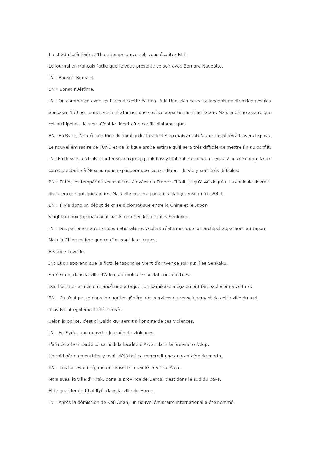 Ilest23hiciàParis,21hentempsuniversel,vousécoutezRFI.LejournalenfrançaisfacilequejevousprésentecesoiravecBernardNageotte.JN:BonsoirBernard.BN:BonsoirJérôme.JN:Oncommenceaveclestitresdecetteédition.AlaUne,desbateauxjaponaisendirectiondesîlesSenkaku.150pers