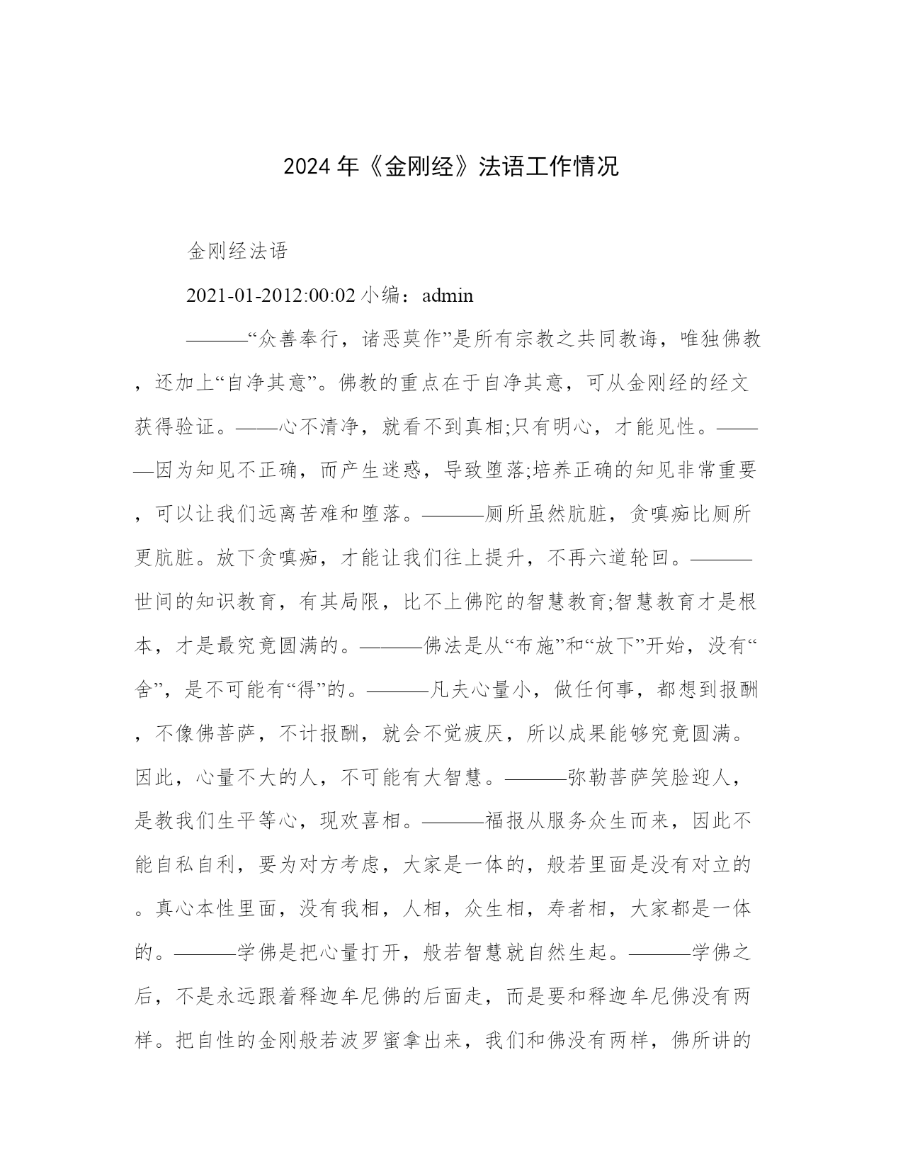 2024年《金刚经》法语工作情况金刚经法语2021-01-2012:00:02小编:admin———“众善奉行,诸恶莫作”是所有宗教之共同教诲,唯独佛教,还加上“自净其意”。佛教的重点在于自净其意,可从金刚经的经文获得验证。——心不清净,就看不到真相;只有明心,才能见性。———因为知见不正确,而产生迷惑,导致堕落;培养正确的知见非常重要,可以让我们远离苦难和堕落。———厕所虽然肮脏,贪嗔痴比厕所更肮脏。放下贪嗔痴,才能让我们往上提升,不再六道轮回。———世间的知识教育,有其局限,比不上佛陀的智慧教育;智慧