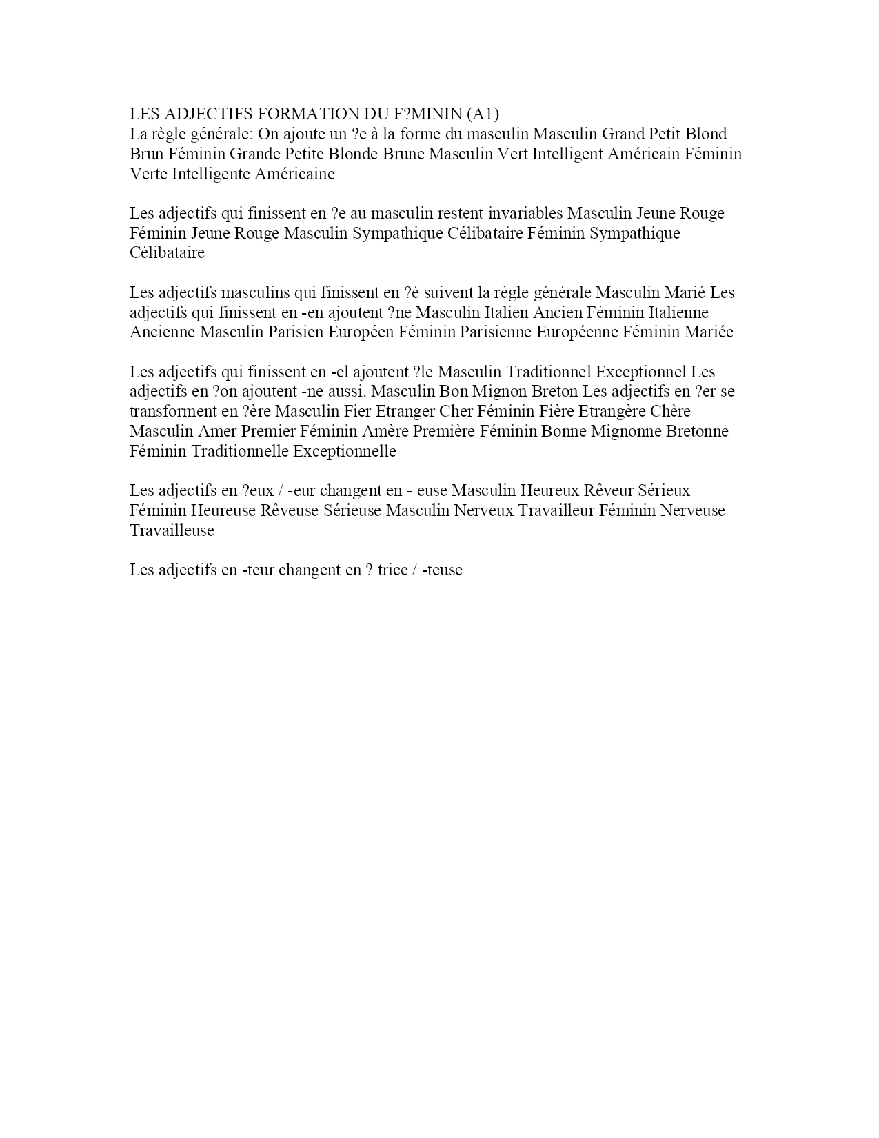 LESADJECTIFSFORMATIONDUF?MININ(A1)Larèglegénérale:Onajouteun?eàlaformedumasculinMasculinGrandPetitBlondBrunFémininGrandePetiteBlondeBruneMasculinVertIntelligentAméricainFémininVerteIntelligenteAméricaineLesadjectifsquifinissenten?eaumasculinrestentinvaria