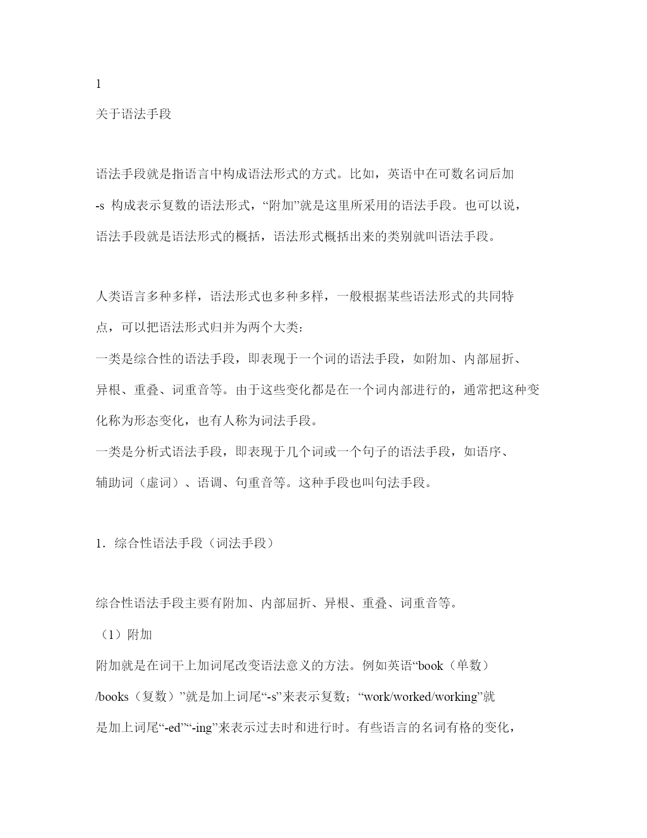 1关于语法手段语法手段就是指语言中构成语法形式的方式。比如,英语中在可数名词后加-s构成表示复数的语法形式,“附加”就是这里所采用的语法手段。也可以说,语法手段就是语法形式的概括,语法形式概括出来的类别就叫语法手段。人类语言多种多样,语法形式也多种多样,一般根据某些语法形式的共同特点,可以把语法形式归并为两个大类:一类是综合性的语法手段,即表现于一个词的语法手段,如附加、内部屈折、异根、重叠、词重音等。由于这些变化都是在一个词内部进行的,通常把这种变化称为形态变化,也有人称为词法手段。一类是分析式语法手段