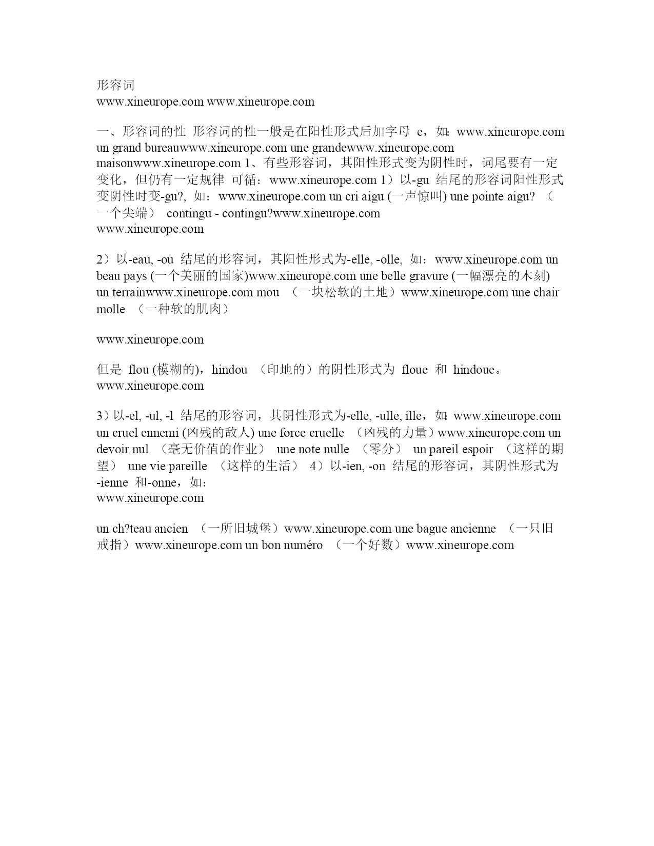 形容词www.xineurope.comwww.xineurope.com一、形容词的性形容词的性一般是在阳性形式后加字母e,如:www.xineurope.comungrandbureauwww.xineurope.comunegrandewww.xineurope.commaisonwww.xineurope.com1、有些形容词,其阳性形式变为阴性时,词尾要有一定变化,但仍有一定规律可循:www.xineurope.com1)以-gu结尾的形容词阳性形式变阴性时变-gu?,如:www.xineuro