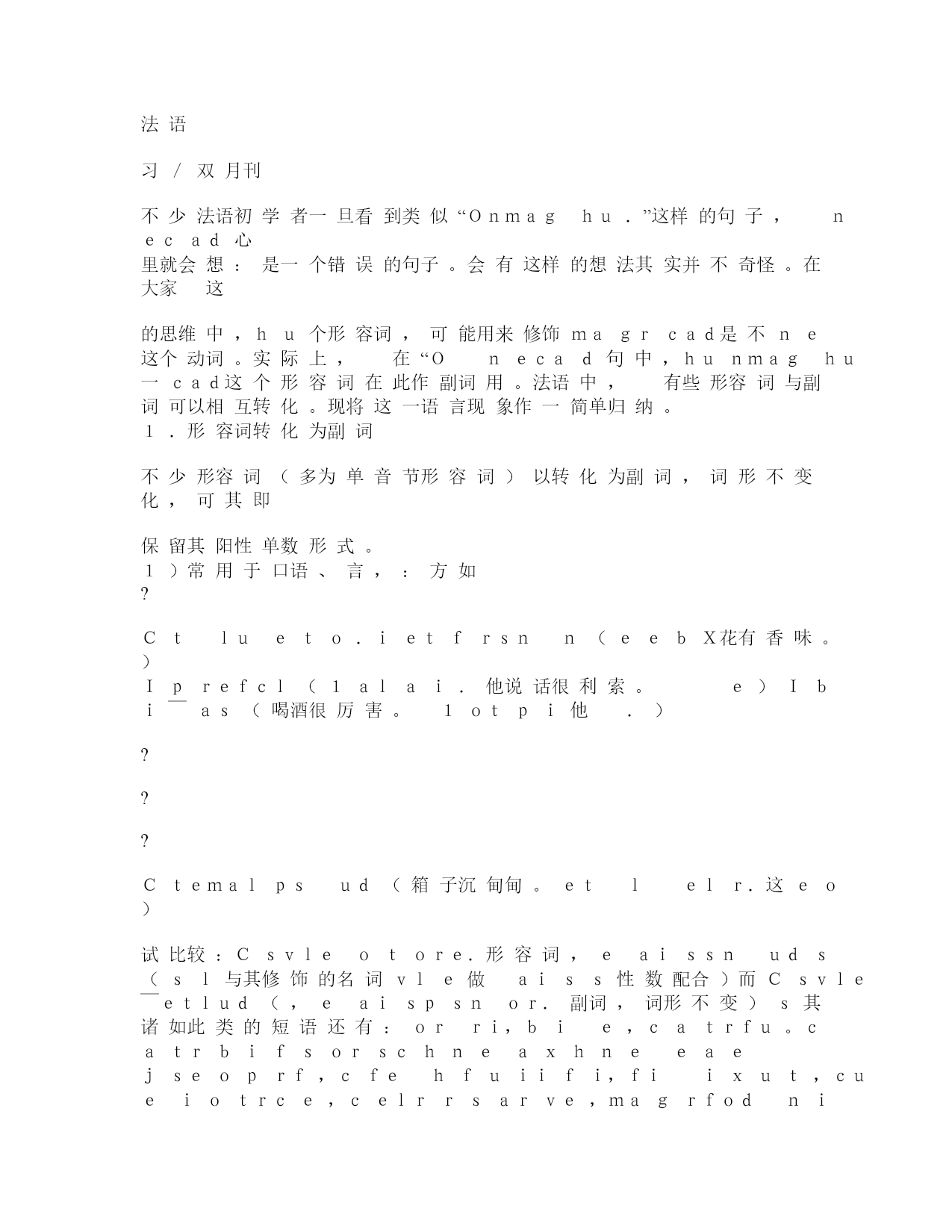 法语习/双月刊不少法语初学者一旦看到类似“Onmaghu.”这样的句子,necad心里就会想:是一个错误的句子。会有这样的想法其实并不奇怪。在大家这的思维中,hu个形容词,可能用来修饰magrcad是不ne这个动词。实际上,在“Onecad句中,hunmaghu一cad这个形容词在此作副词用。法语中,有些形容词与副词可以相互转化。现将这一语言现象作一简单归纳。1.形容词转化为副词不少形容词(多为单音节形容词)以转化为副词,词形不变化,可其即保留其阳性单数形式。1)常用于口语、言,:方如?Ctlueto.i