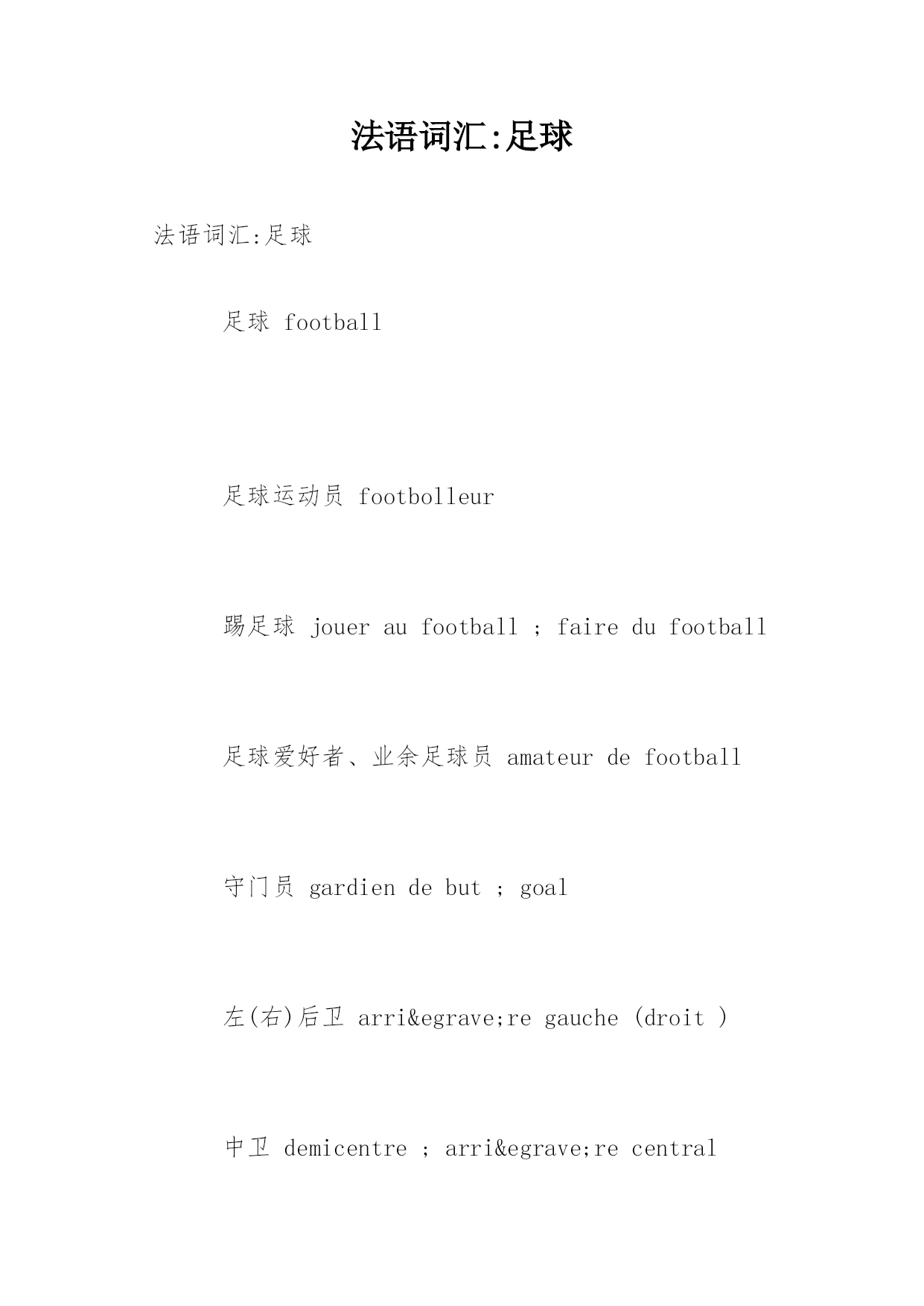 法语词汇:足球法语词汇:足球足球football足球运动员footbolleur踢足球joueraufootball;fairedufootball足球爱好者、业余足球员amateurdefootball守门员gardiendebut;goal左(右)后卫arrièregauche(droit)中卫demicentre;arrièrecentral左(右)前卫demigauche(droit)左(右)边锋ailiergauche(droit)左(右)内锋intergauche(