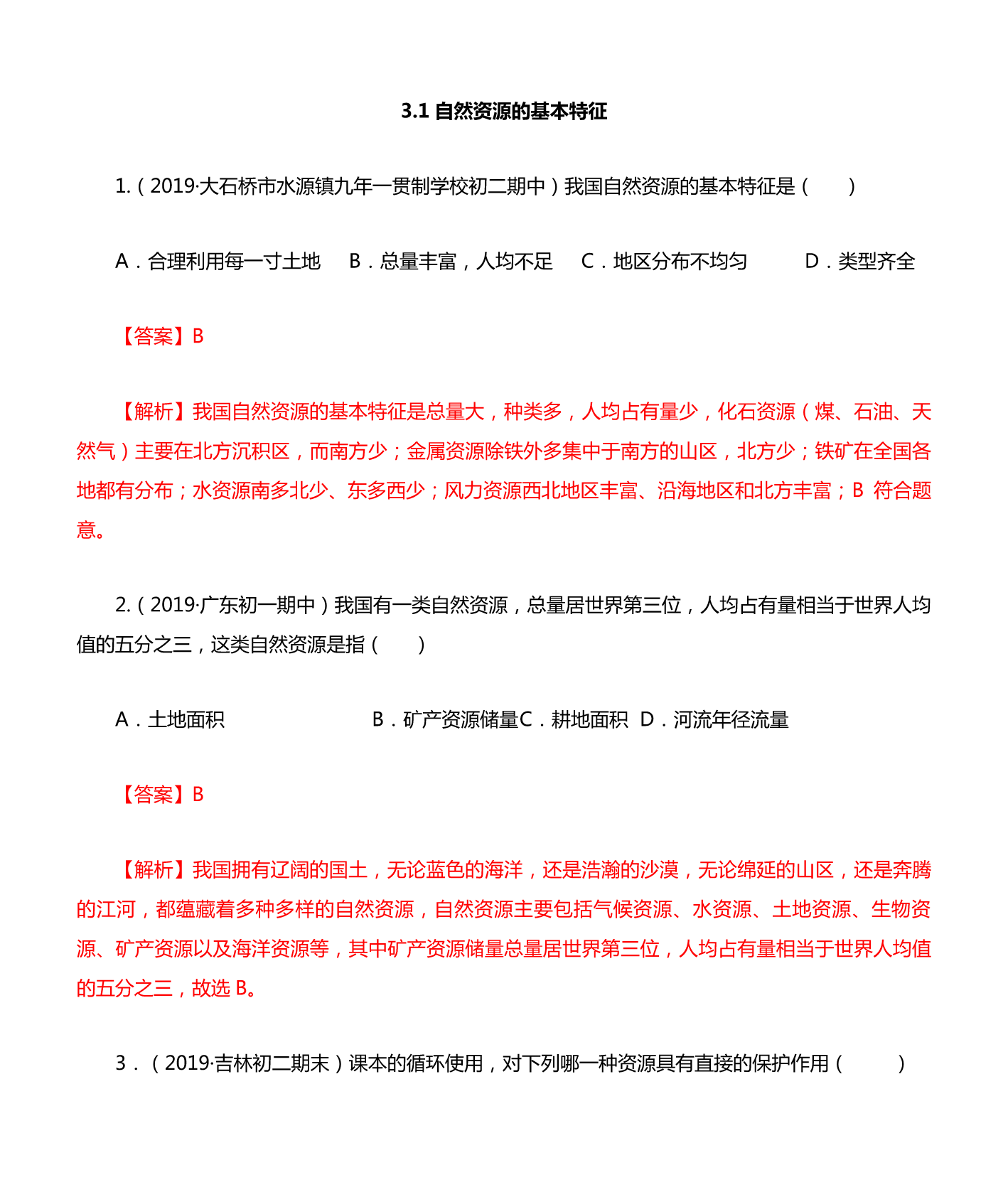 3.1自然资源的基本特征1.(2019·大石桥市水源镇九年一贯制学校初二期中)我国自然资源的基本特征是()A.合理利用每一寸土地B.总量丰富,人均不足C.地区分布不均匀D.类型齐全【答案】B【解析】我国自然资源的基本特征是总量大,种类多,人均占有量少,化石资源(煤、石油、天然气)主要在北方沉积区,而南方少;金属资源除铁外多集中于南方的山区,北方少;铁矿在全国各地都有分布;水资源南多北少、东多西少;风力资源西北地区丰富、沿海地区和北方丰富;B符合题意。2.(2019·广东初一期中)我国有一类自然资源,总量居