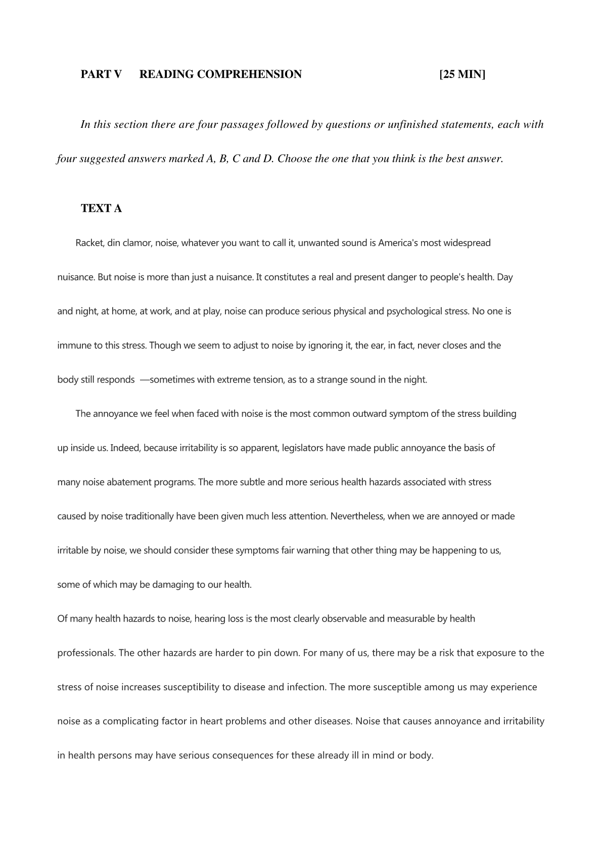 PARTVREADINGCOMPREHENSION[25MIN]Inthissectiontherearefourpassagesfollowedbyquestionsorunfinishedstatements,eachwithfoursuggestedanswersmarkedA,B,CandD.Choosetheonethatyouthinkisthebestanswer.TEXTARacket,dinclamor,noise,whateveryouwanttocallit,unwantedsoun