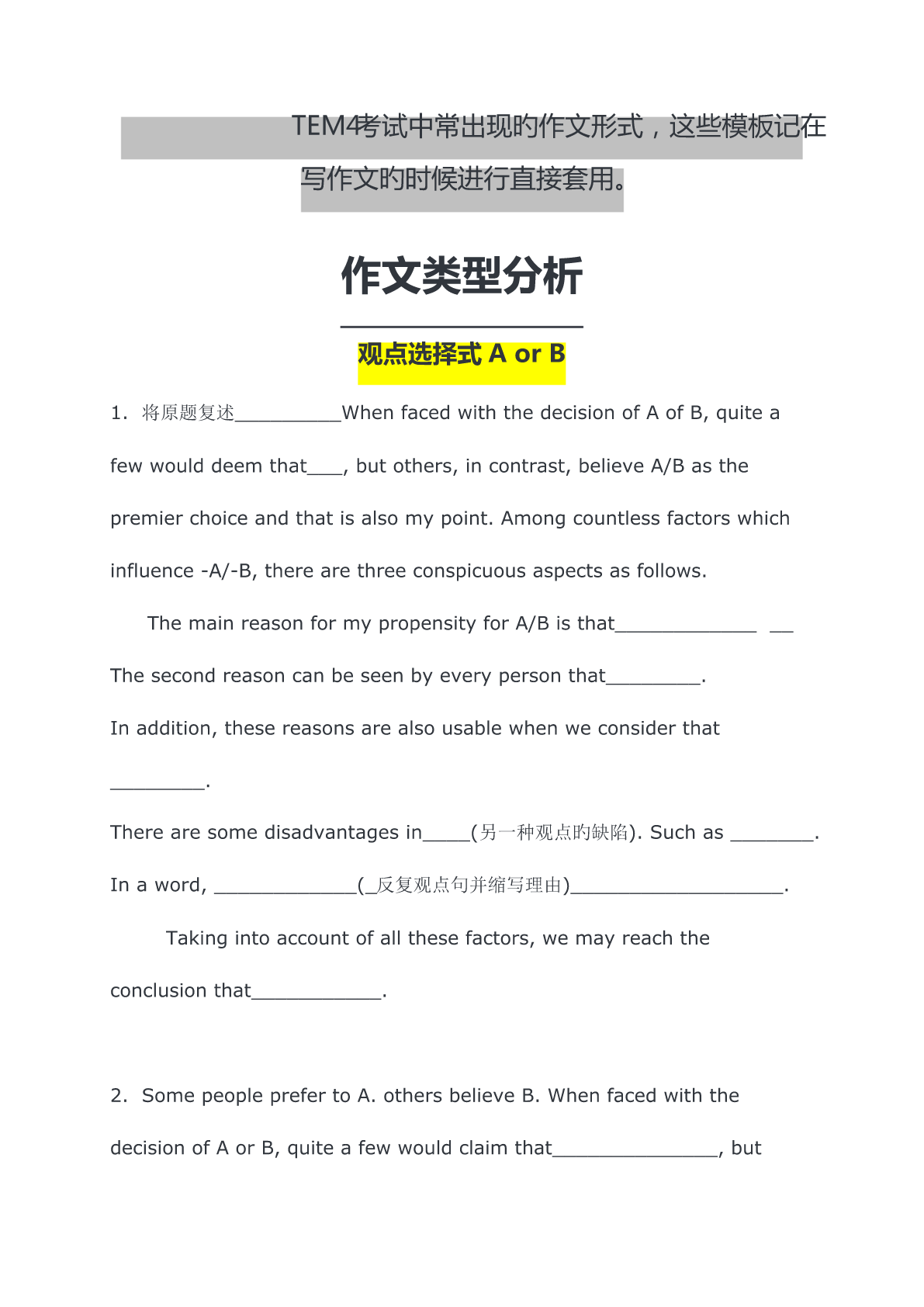 TEM4考试中常出现旳作文形式,这些模板记在写作文旳时候进行直接套用。作文类型分析观点选择式AorB1.将原题复述_________WhenfacedwiththedecisionofAofB,quiteafewwoulddeemthat___,butothers,incontrast,believeA/Basthepremierchoiceandthatisalsomypoint.Amongcountlessfactorswhichinfluence-A/-B,therearethreeconspicu