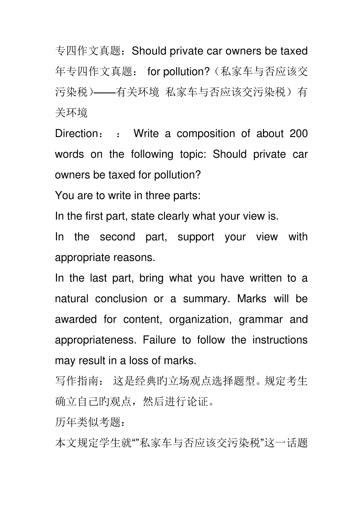 专四作文真题:Shouldprivatecarownersbetaxed年专四作文真题:forpollution?(私家车与否应该交污染税)——有关环境私家车与否应该交污染税)有关环境Direction::Writeacompositionofabout200wordsonthefollowingtopic:Shouldprivatecarownersbetaxedforpollution?Youaretowriteinthreeparts:Inthefirstpart,stateclearlywhaty