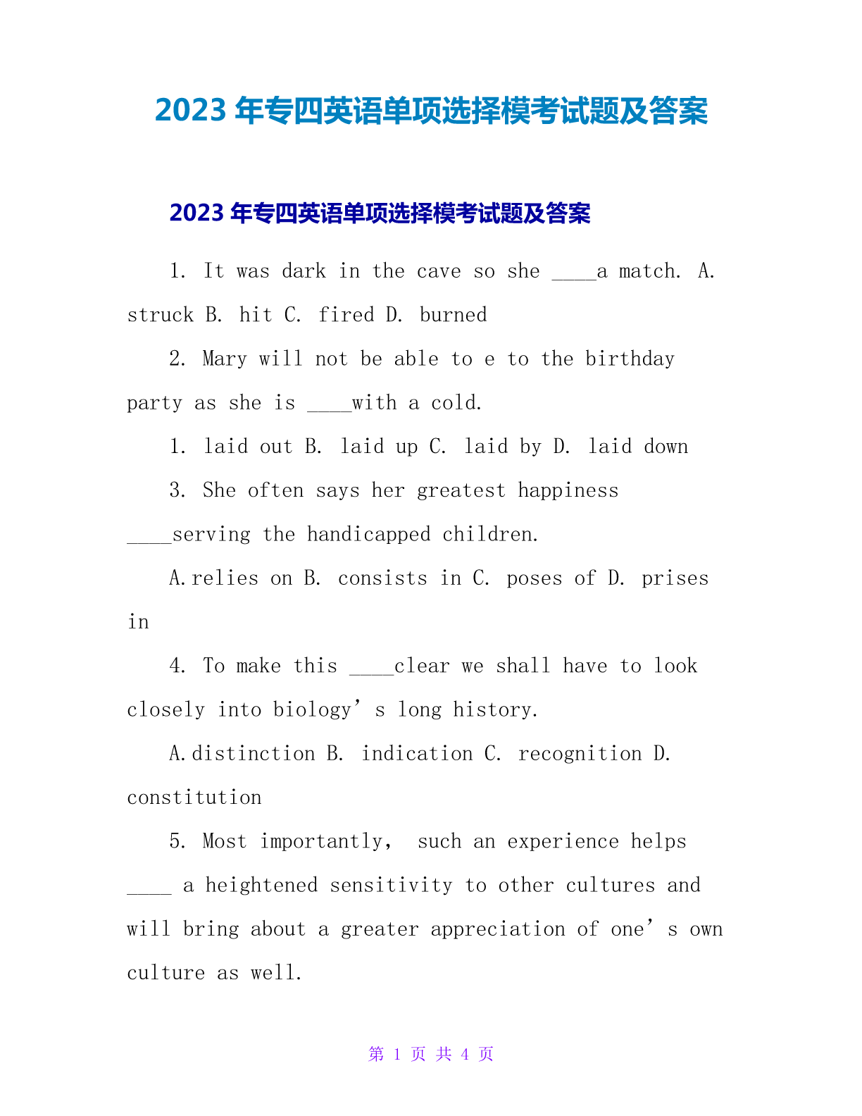 2023年专四英语单项选择模考试题及答案2023年专四英语单项选择模考试题及答案1.Itwasdarkinthecavesoshe____amatch.A.struckB.hitC.firedD.burned2.Marywillnotbeabletoetothebirthdaypartyassheis____withacold.1.laidoutB.laidupC.laidbyD.laiddown3.Sheoftensayshergreatesthappiness____servingthehandica