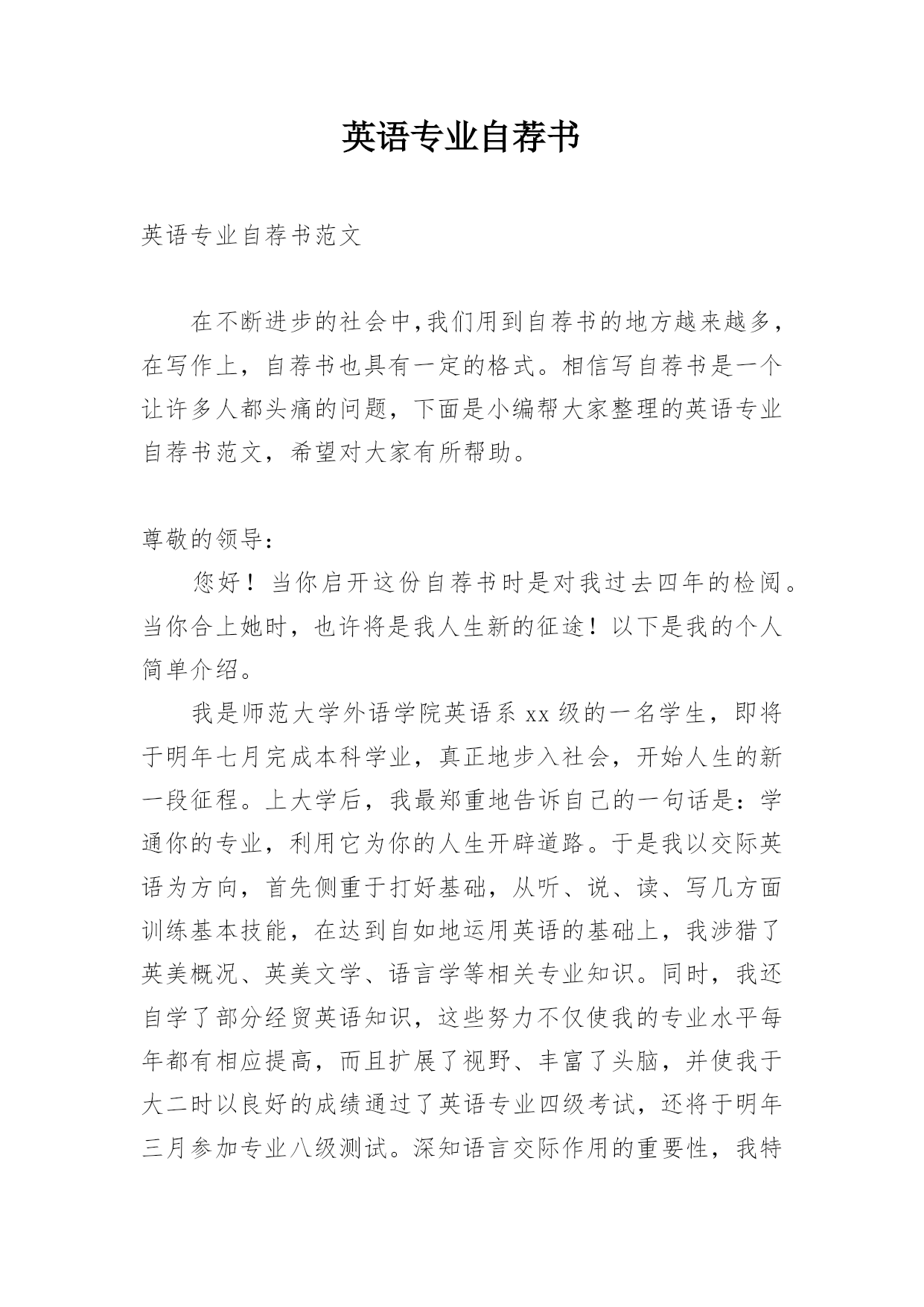 英语专业自荐书英语专业自荐书范文在不断进步的社会中,我们用到自荐书的地方越来越多,在写作上,自荐书也具有一定的格式。相信写自荐书是一个让许多人都头痛的问题,下面是小编帮大家整理的英语专业自荐书范文,希望对大家有所帮助。尊敬的领导:您好!当你启开这份自荐书时是对我过去四年的检阅。当你合上她时,也许将是我人生新的征途!以下是我的个人简单介绍。我是师范大学外语学院英语系xx级的一名学生,即将于明年七月完成本科学业,真正地步入社会,开始人生的新一段征程。上大学后,我最郑重地告诉自己的一句话是:学通你的专业,利用它