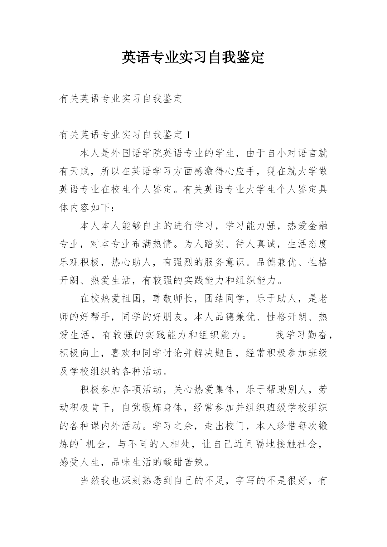 英语专业个人评价英语专业个人评价作为英语专业的一名学子,对英语一直保持着浓厚的兴趣,一直孜孜不倦的畅游在英语的世界里。面临毕业,希望自己能够有个好的发挥的空间,把自己所学所想的服务于社会。扎扎实实的做一个出色的人才。大学四年里,一直有兼职做家庭教师,接触了很多不同年级的学生,积累了丰富的经念。老师,在我心里从来就是个神圣的职业,目前正在准备考教师证,我希望将来能够做个优秀的教师,能够帮助很多人实现自己的梦想。英语专业应届毕业生个人自我评价2015-11-2618:10|#2楼一转眼,大学四年生活即将结束,