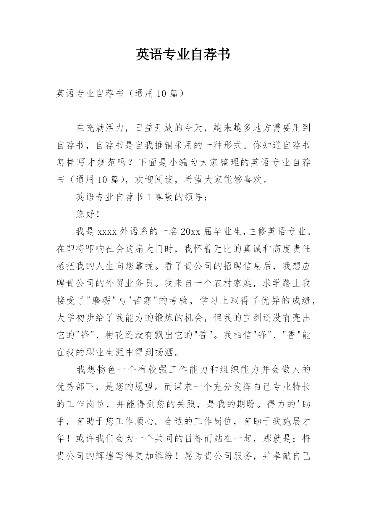 英语专业自荐书英语专业自荐书(通用10篇)在充满活力,日益开放的今天,越来越多地方需要用到自荐书,自荐书是自我推销采用的一种形式。你知道自荐书怎样写才规范吗?下面是小编为大家整理的英语专业自荐书(通用10篇),欢迎阅读,希望大家能够喜欢。英语专业自荐书1尊敬的领导:您好!我是xxxx外语系的一名20xx届毕业生,主修英语专业。在即将叩响社会这扇大门时,我怀着无比的真诚和高度责任感把我的人生向您靠拢。看了贵公司的招聘信息后,我想应聘贵公司的外贸业务员。我来自一个农村家庭,求学路上我接受了"磨砺"与"苦寒"的
