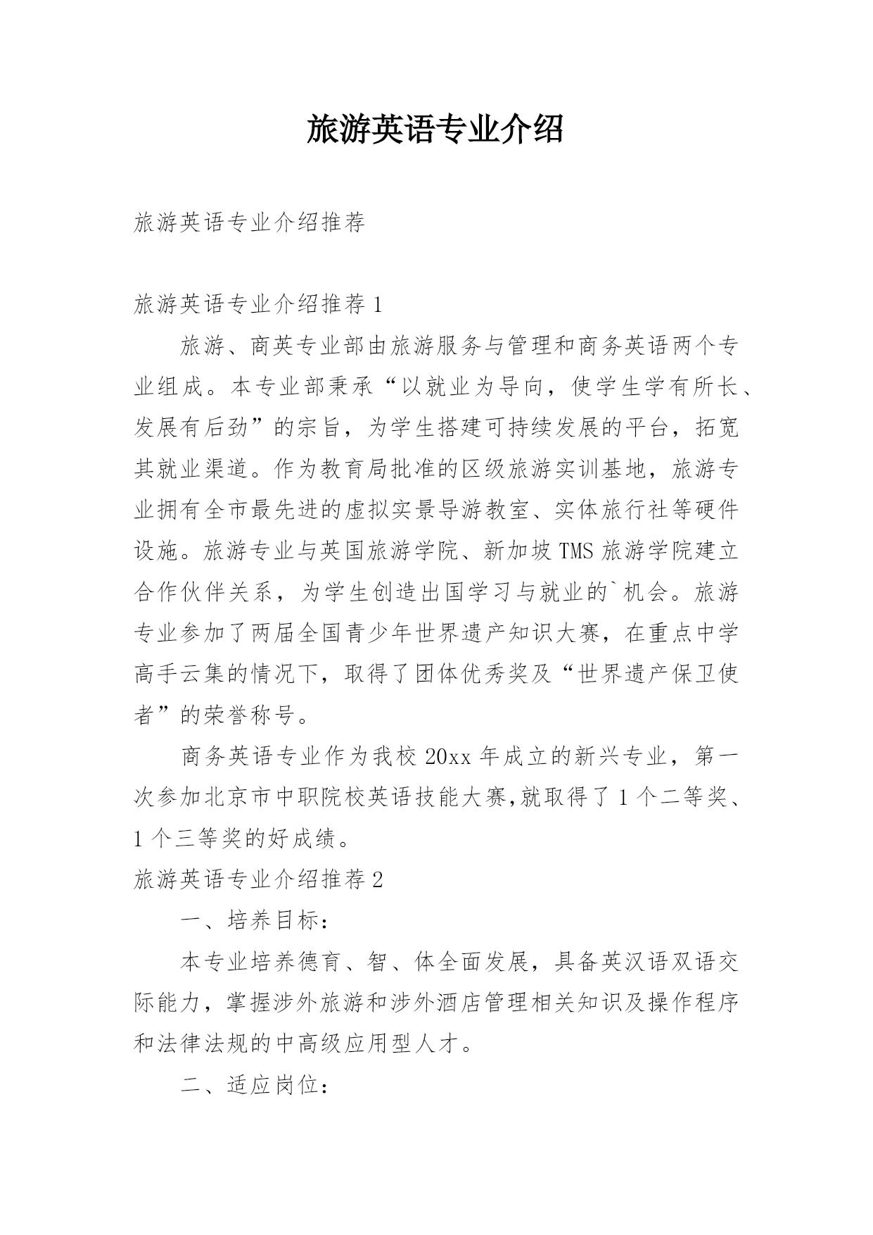 旅游英语专业介绍旅游英语专业介绍推荐旅游英语专业介绍推荐1旅游、商英专业部由旅游服务与管理和商务英语两个专业组成。本专业部秉承“以就业为导向,使学生学有所长、发展有后劲”的宗旨,为学生搭建可持续发展的平台,拓宽其就业渠道。作为教育局批准的区级旅游实训基地,旅游专业拥有全市最先进的虚拟实景导游教室、实体旅行社等硬件设施。旅游专业与英国旅游学院、新加坡TMS旅游学院建立合作伙伴关系,为学生创造出国学习与就业的`机会。旅游专业参加了两届全国青少年世界遗产知识大赛,在重点中学高手云集的情况下,取得了团体优秀奖及“