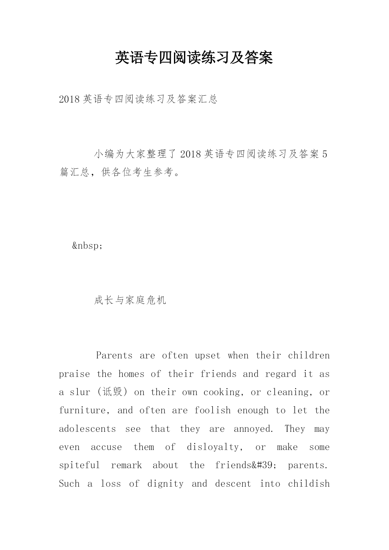 英语专四阅读练习及答案2018英语专四阅读练习及答案汇总小编为大家整理了2018英语专四阅读练习及答案5篇汇总,供各位考生参考。 成长与家庭危机Parentsareoftenupsetwhentheirchildrenpraisethehomesoftheirfriendsandregarditasaslur(诋毁)ontheirowncooking,orcleaning,orfurniture,andoftenarefoolishenoughtolettheadolescentsseethat