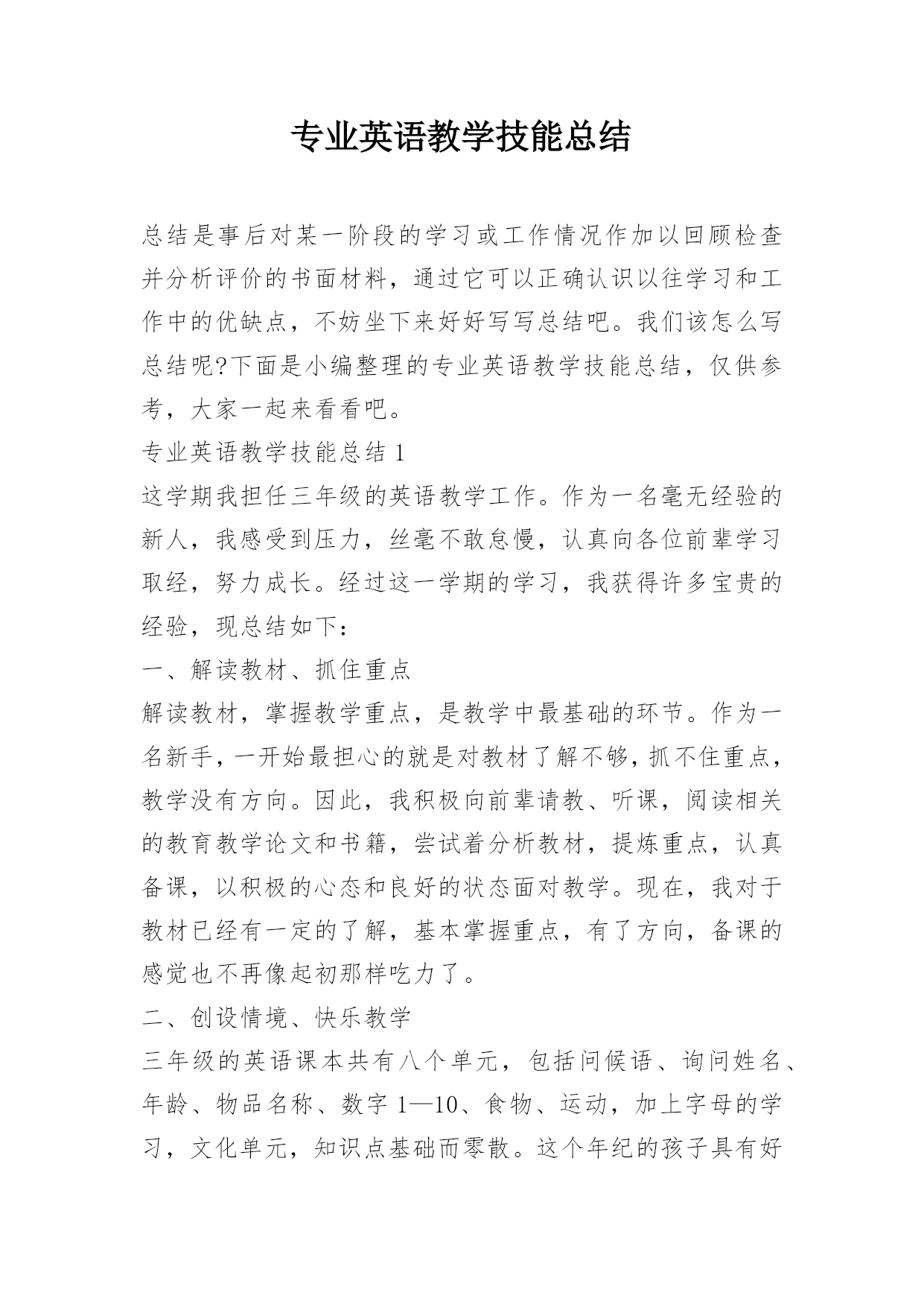 专业英语教学技能总结总结是事后对某一阶段的学习或工作情况作加以回顾检查并分析评价的书面材料,通过它可以正确认识以往学习和工作中的优缺点,不妨坐下来好好写写总结吧。我们该怎么写总结呢?下面是小编整理的专业英语教学技能总结,仅供参考,大家一起来看看吧。专业英语教学技能总结1这学期我担任三年级的英语教学工作。作为一名毫无经验的新人,我感受到压力,丝毫不敢怠慢,认真向各位前辈学习取经,努力成长。经过这一学期的学习,我获得许多宝贵的经验,现总结如下:一、解读教材、抓住重点解读教材,掌握教学重点,是教学中最基础的环节