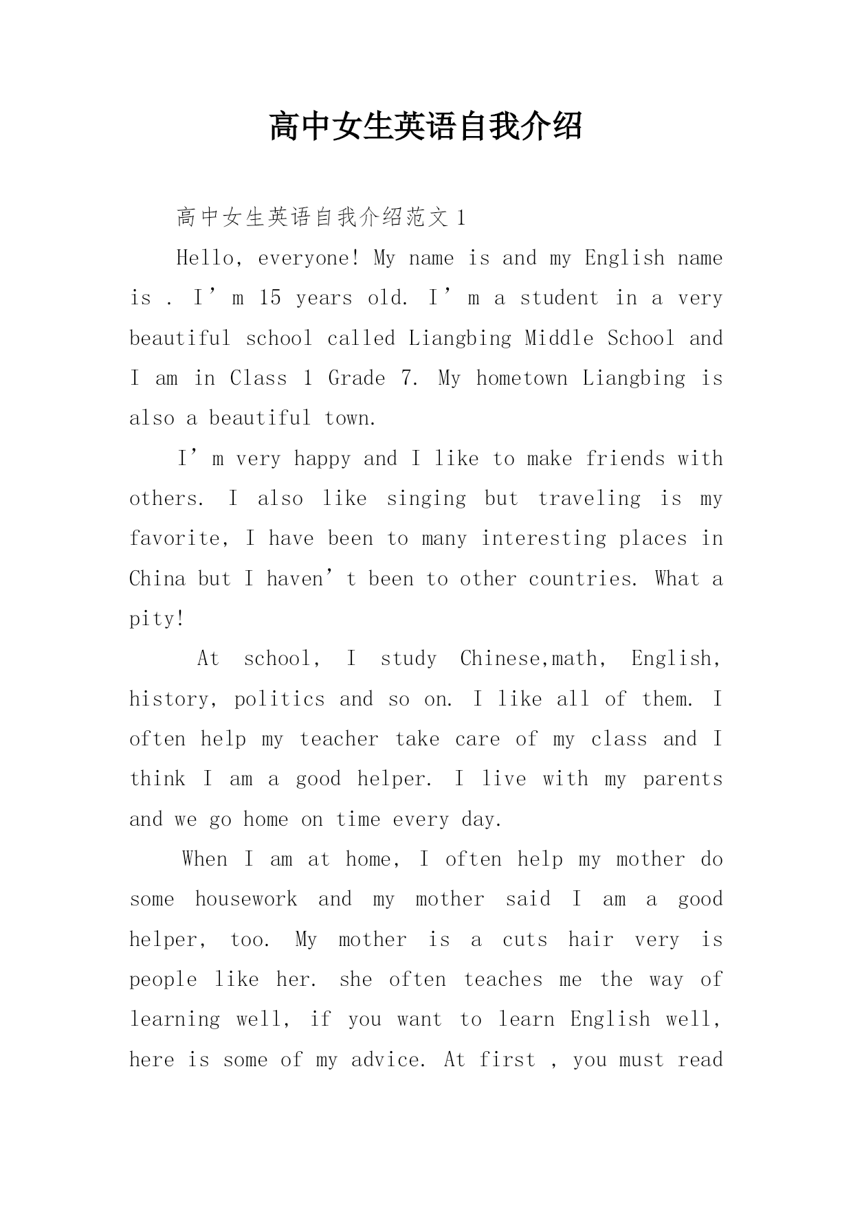 高中女生英语自我介绍高中女生英语自我介绍范文1Hello,everyone!MynameisandmyEnglishnameis.I’m15yearsold.I’mastudentinaverybeautifulschoolcalledLiangbingMiddleSchoolandIaminClass1Grade7.MyhometownLiangbingisalsoabeautifultown.I’mveryhappyandIliketomakefriendswithothers.Ialsolikesi