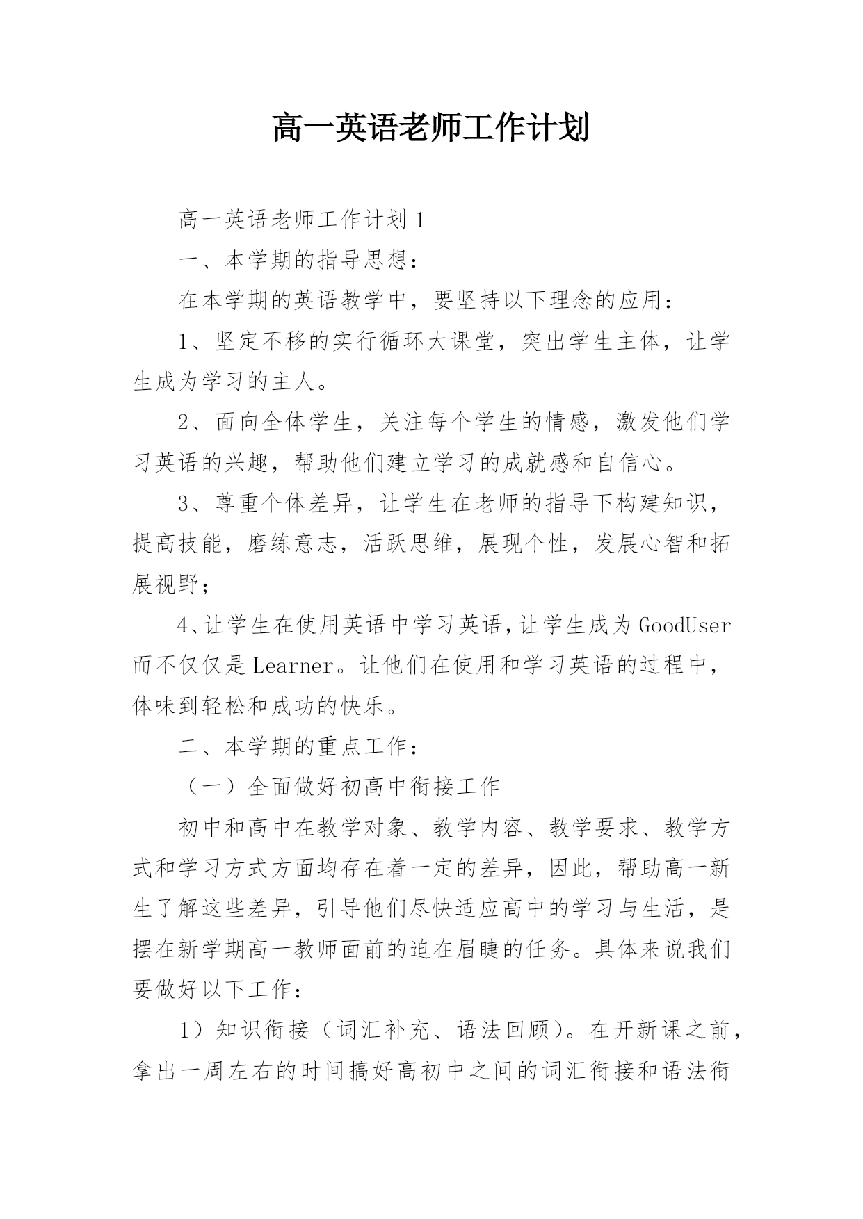 高一英语老师工作计划高一英语老师工作计划1一、本学期的指导思想:在本学期的英语教学中,要坚持以下理念的应用:1、坚定不移的实行循环大课堂,突出学生主体,让学生成为学习的主人。2、面向全体学生,关注每个学生的情感,激发他们学习英语的兴趣,帮助他们建立学习的成就感和自信心。3、尊重个体差异,让学生在老师的指导下构建知识,提高技能,磨练意志,活跃思维,展现个性,发展心智和拓展视野;4、让学生在使用英语中学习英语,让学生成为GoodUser而不仅仅是Learner。让他们在使用和学习英语的过程中,体味到轻松和成功